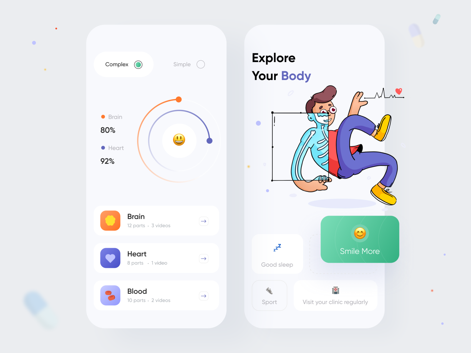 В данном случае дизайн фокусируется в деталях: сетка интерфейса, шрифты, иконки, цвета, UX, анимация.