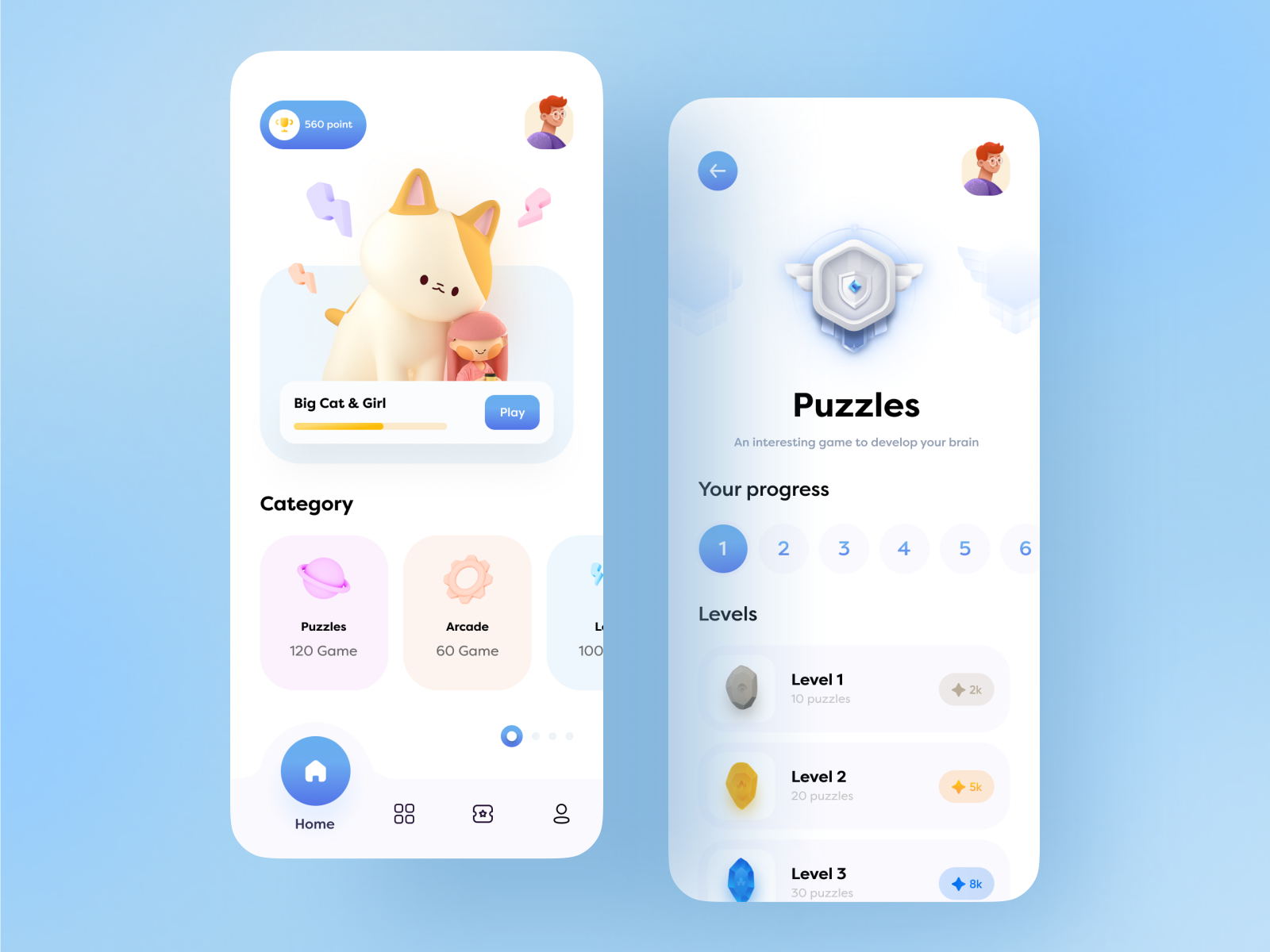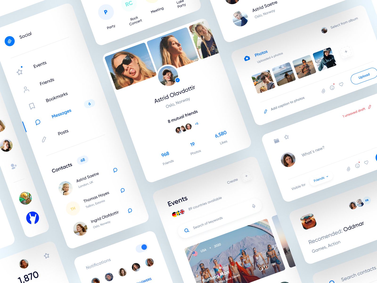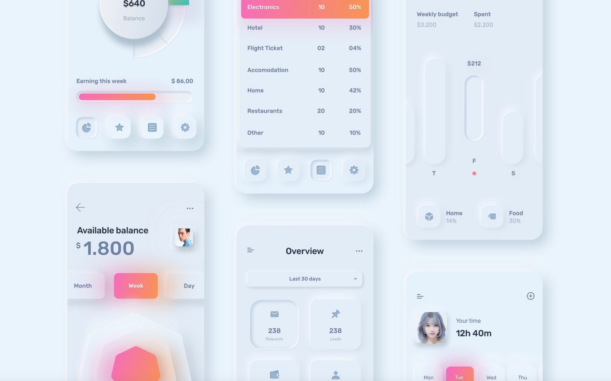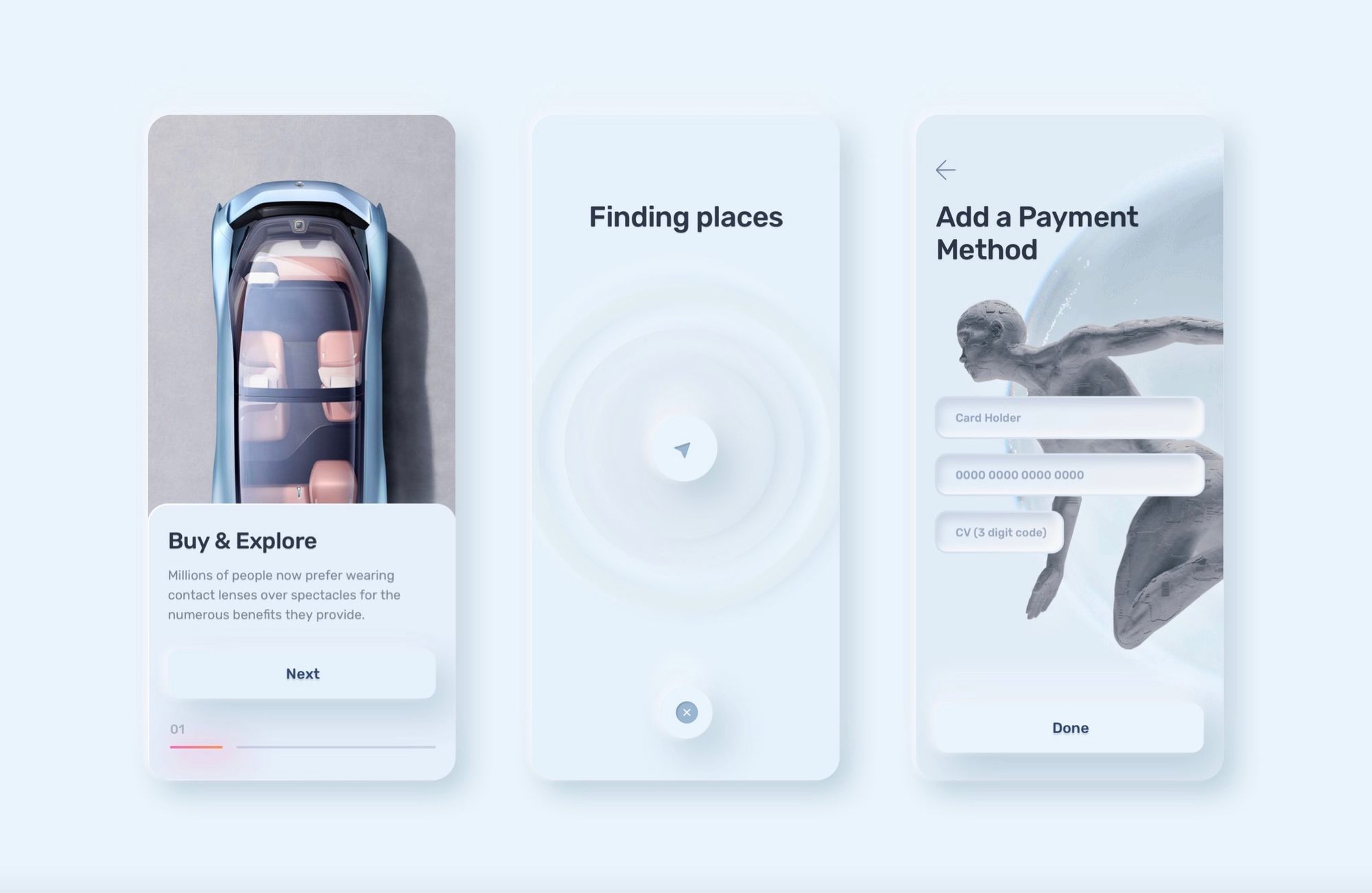 Это дает ощущение, что такие компоненты, как кнопки или карточки, на самом деле находятся внутри фона и видны только потому, что они выступают изнутри. Общий стиль - это сплошные цвета, низкий контраст и правильная игра теней.