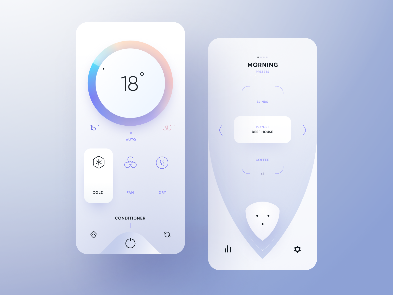 Градиенты тоже немного эволюционировали и стали более сложными. Теперь недостаточно использовать линейный градиент как ранее. Надо миксовать разные цвета и использовать наложение. Плюс в интерфейсах все чаще начал использоваться эффект Color Blur. Чаще всего в качестве background. Это придает интерфейсу глубину и объем. Как правило это своего рода "цветные пятна".