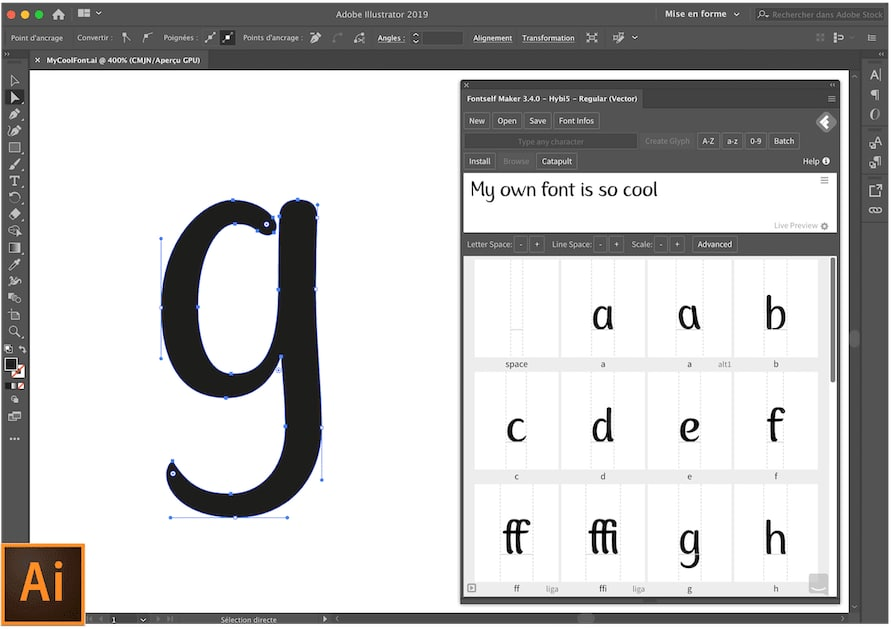 Плагін Fontself дозволяє перетворити будь-яку фігуру або напис на векторний шрифт. З ним можна перетворити свій рукописний текст на шрифти Opentype, перетягнути будь-яку букву або символ значка і, тим самим створити свій шрифт.