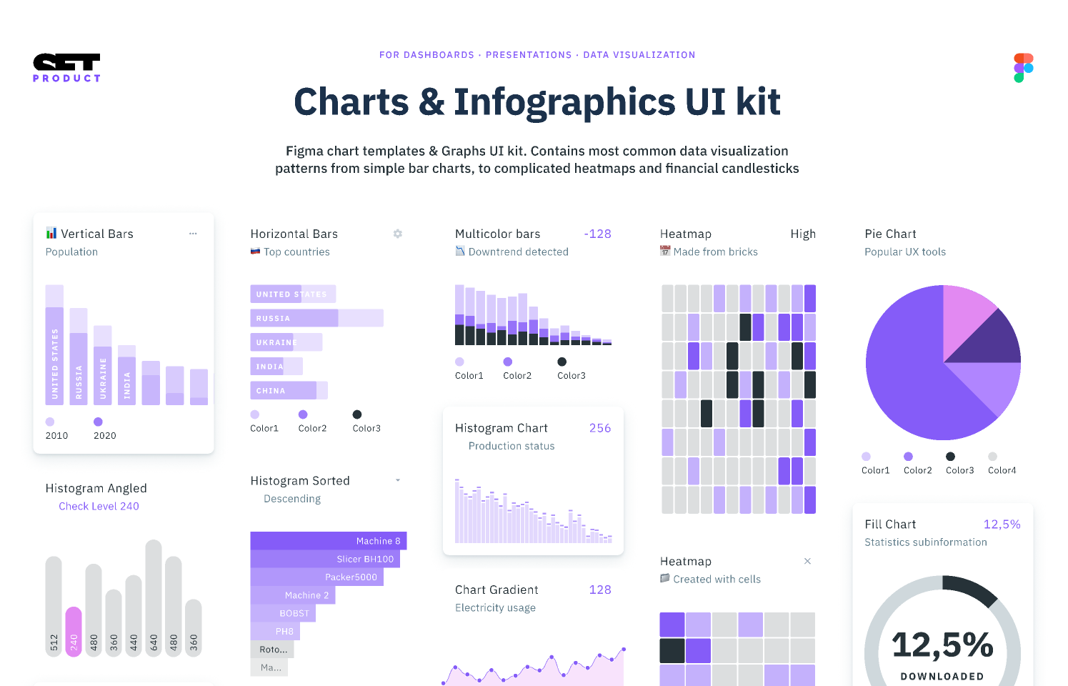 Бібліотека діаграм Figma, що складається із різних компонентів. Містить найпоширеніші шаблони візуалізації даних, від простих гістограм до складних теплових карток та фінансових свічок. Підходить для інформаційних панелей, презентацій, візуалізацій чи іншого типу проектів з дизайну даних. Набір дуже цікавий, можна кастомізувати все під свій проект, змінювати дані, кольори та текст.