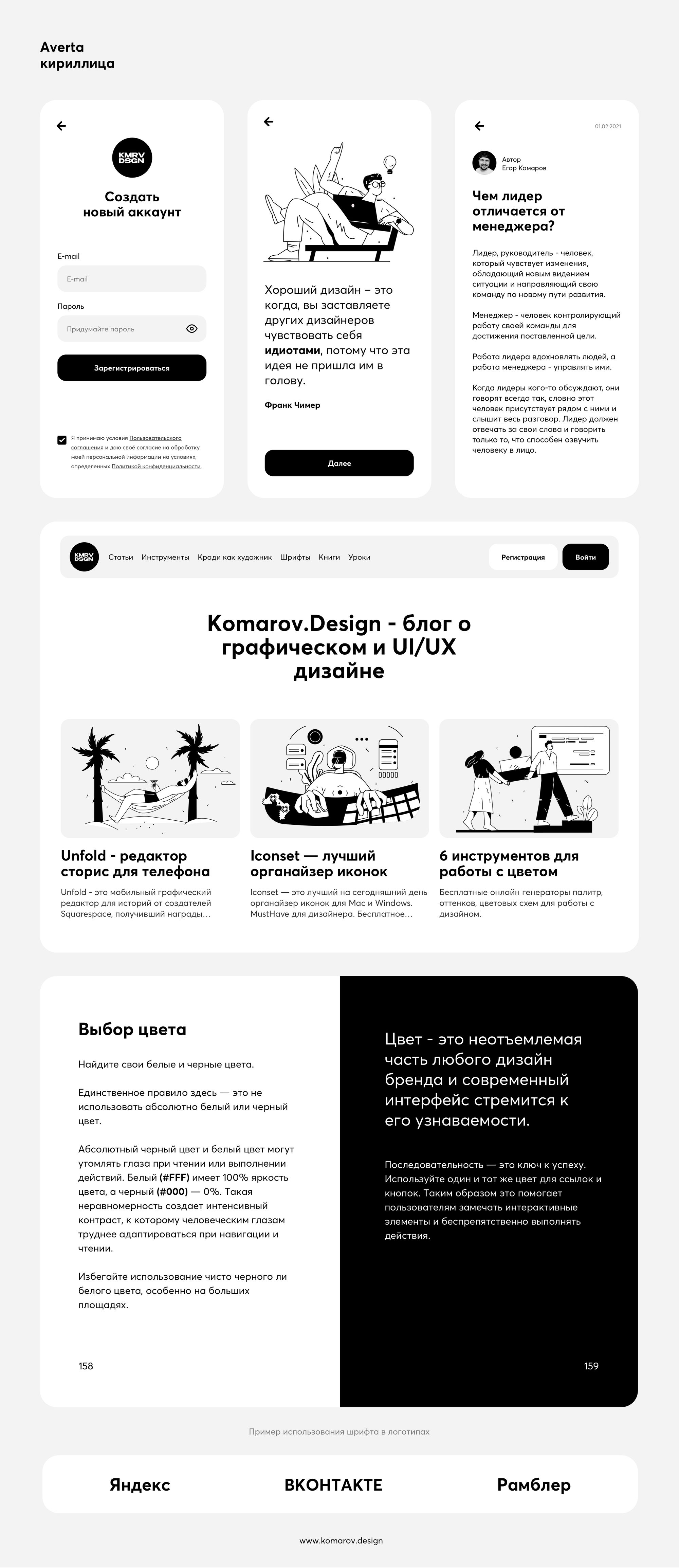 Для того, чтобы было наглядно, как шрифт выглядит в использовании, я создал прототипы макетов, где шрифт используется в различных сценариях. Так легче понять, сильные и слабые стороны шрифта.
