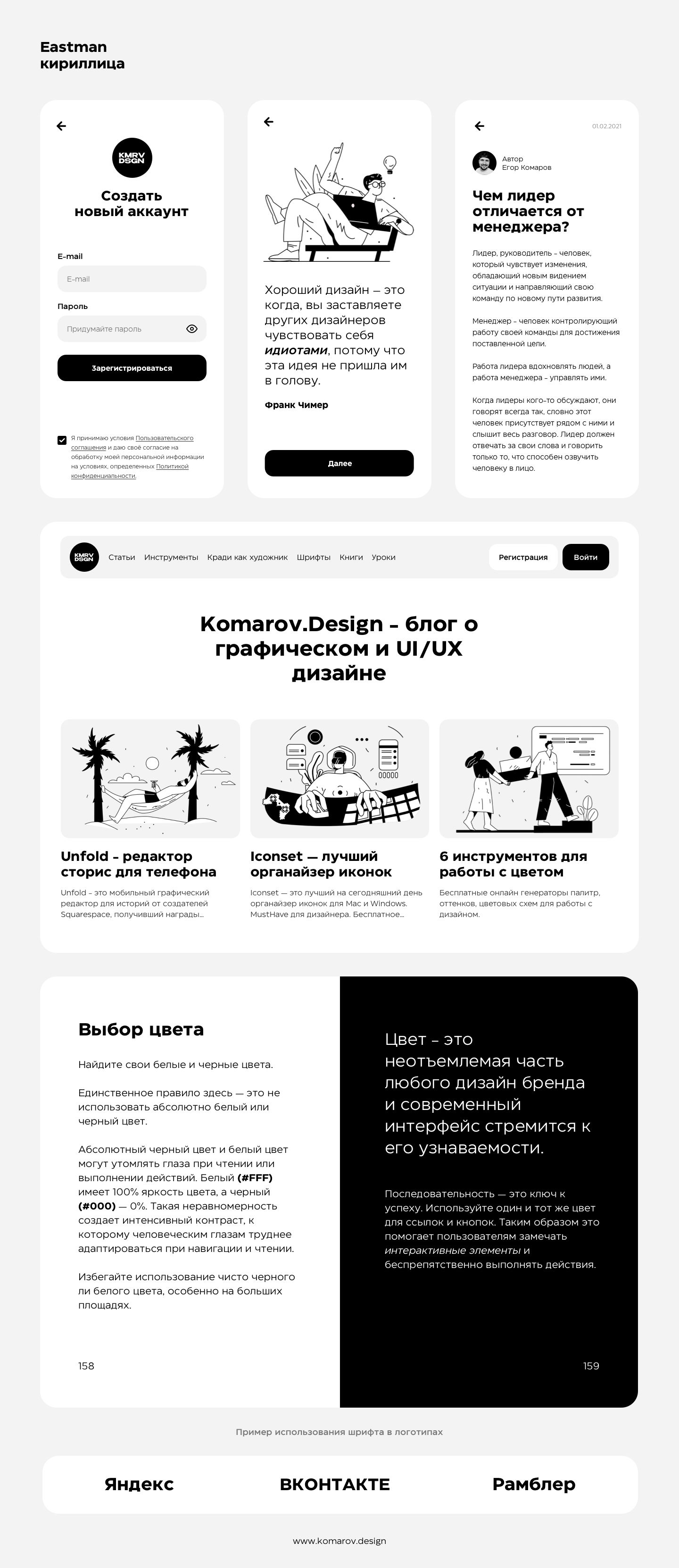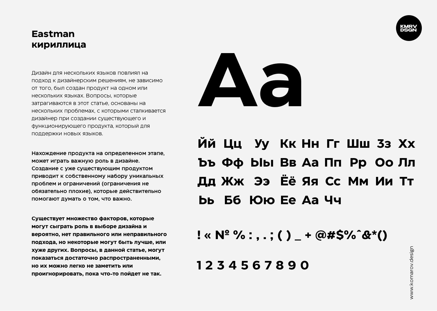 Кириллический шрифт Eastman был разработан в 2020 году для Zetafonts Франческо Кановаро и Андреа Тартарелли с помощью Соленн Бордо. Это семейство рабочих лошадок с геометрическим рисунком, разработанное для максимальной универсальности как при отображении, так и при использовании текста, с широким диапазоном веса и прочной монолинейной конструкцией с высокой высотой x, что делает Eastman чрезвычайно удобочитаемым на бумаге и на экране.