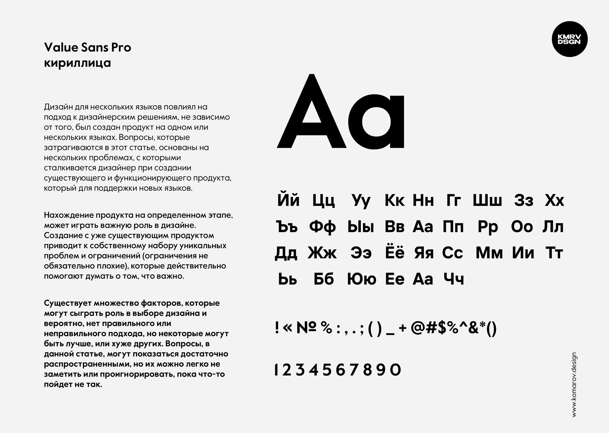 Value - это современное семейство двух гарнитур. Value Sans и Value Serif были созданы в ответ на разговоры, посвященные понятиям культурного и финансового обмена: Value Sans заимствует стиль и поведение у таких прецедентов, как Elegant Grotesk (Германия) и Granby (Великобритания); Value Serif отдает дань уважения таким предкам, как Plantin Infant (Франция, США) и Italian Old Style (США).