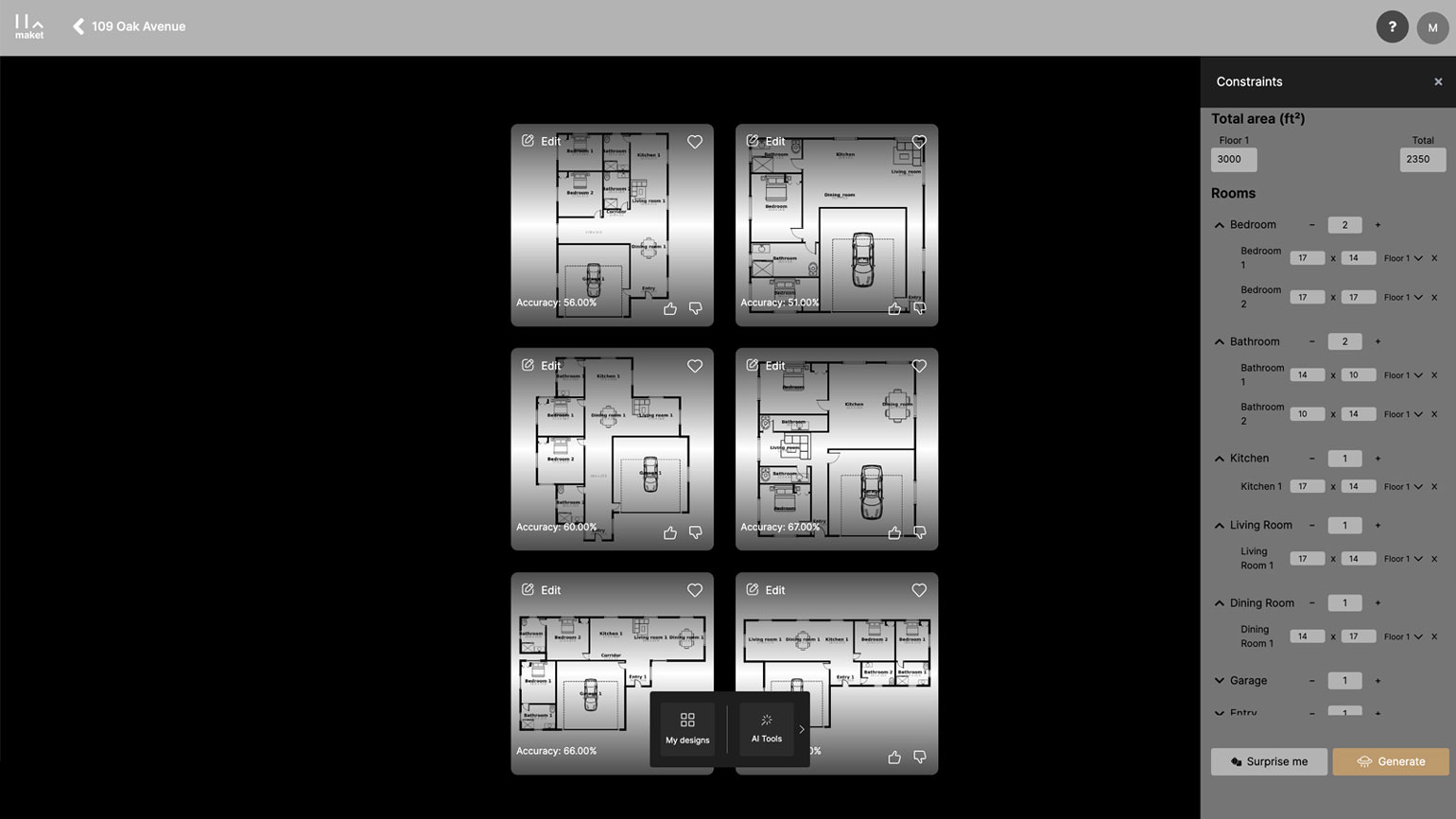 Maket.ai — це інструмент, який дозволяє створювати точні плани поверхів на основі заданих параметрів, таких як тип приміщення, площа та кількість кімнат. Додаток має віртуального помічника, який може надати інформацію про матеріали та дати поради щодо дизайну. Користувачі можуть ставити запитання (англійською мовою) про будівельні норми, проте програма зосереджена на зарубіжних стандартах.