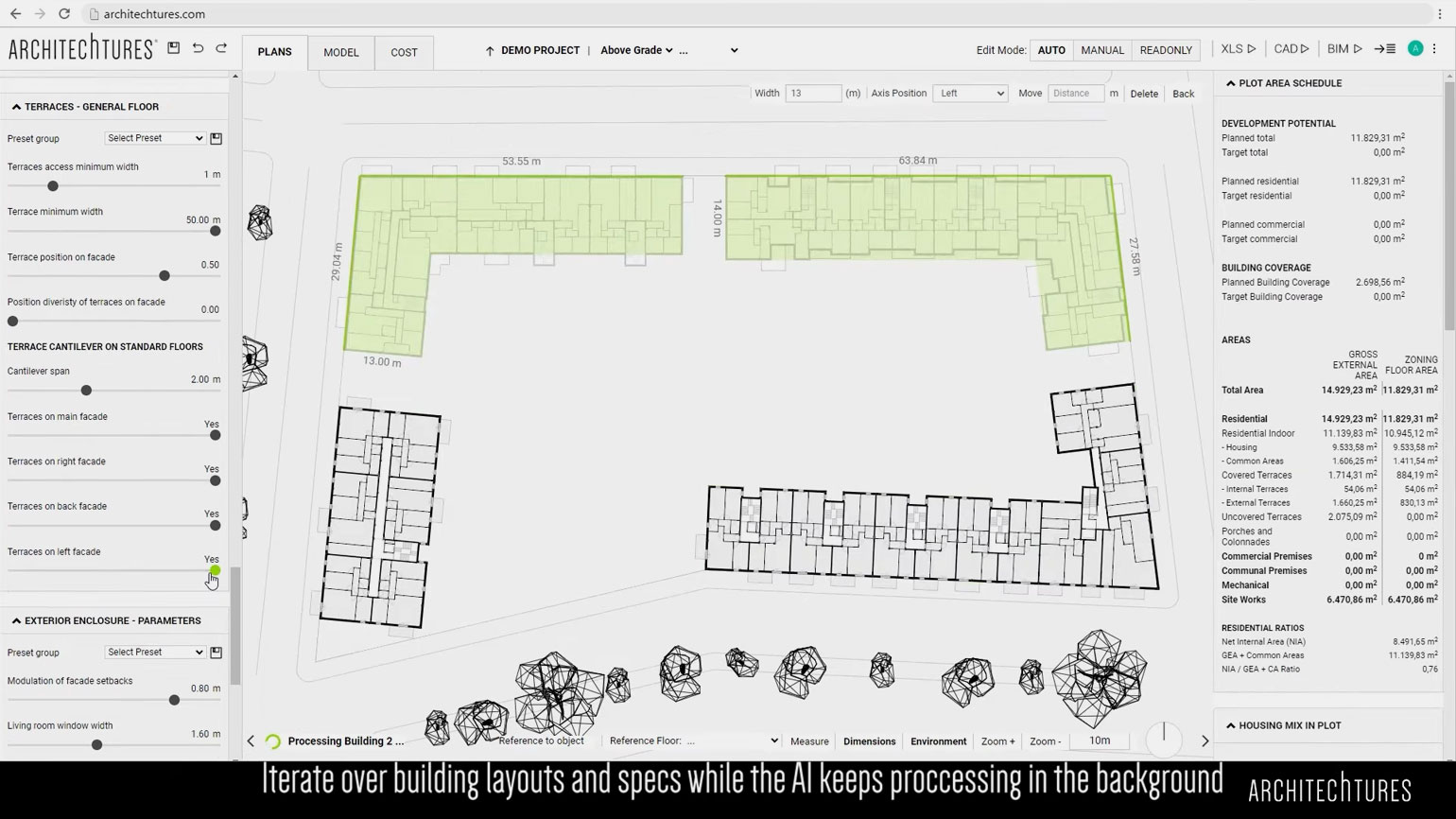 Architechtures — це інструмент, який дозволяє проєктувати житлові приміщення, враховуючи задані параметри (тип об'єкта, особливості зонування) та нормативні стандарти. Він збирає дані про різні елементи будівництва, що дозволяє користувачам розраховувати їх вартість. Отримані проєкти можна редагувати вручну, а також завантажувати креслення та звіти у форматах XLSX, DXF та IFC.