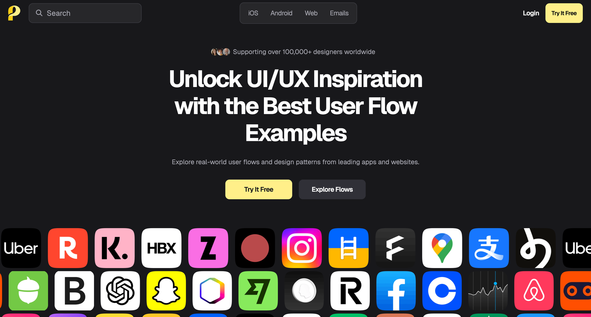 Page Flows пропонує приклади користувацьких потоків від топових додатків і сайтів, таких як Airbnb, Slack, Headway, Uber. Платформа надає приклади онбордингу, сторінок входу, checkout-процесів тощо. Дизайнери можуть вивчати ці шаблони, щоб створювати інтуїтивно зрозумілі та привабливі інтерфейси, спираючись на перевірені рішення.