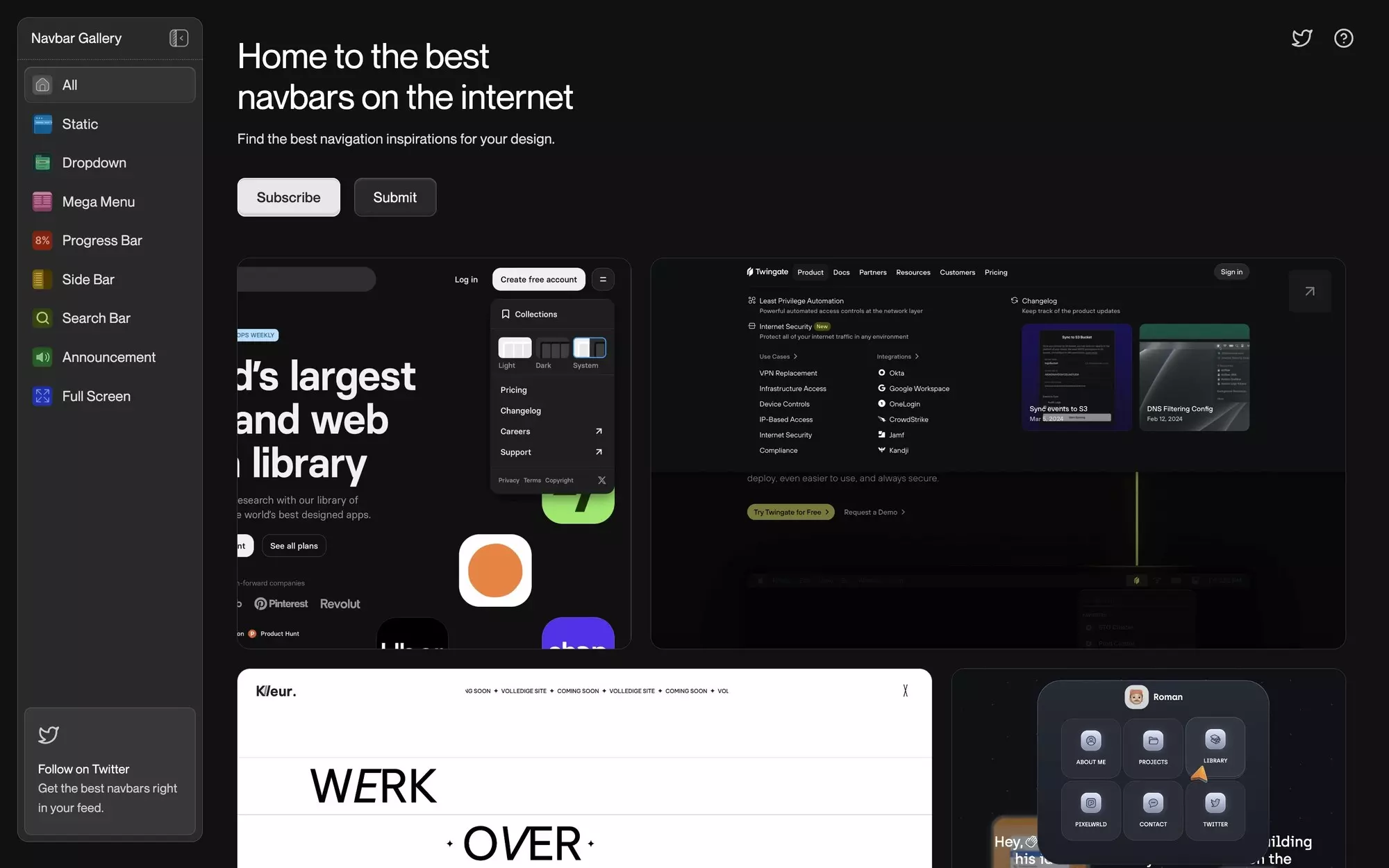 Navbar Gallery — це колекція найкращих дизайнів навігаційних панелей. Основна функція — надихати: ви можете переглядати різні макети, колірні схеми та стилі, щоб покращити UX вашого сайту. Ресурс допомагає швидко знайти ідеї для створення зручної та естетичної навігації.