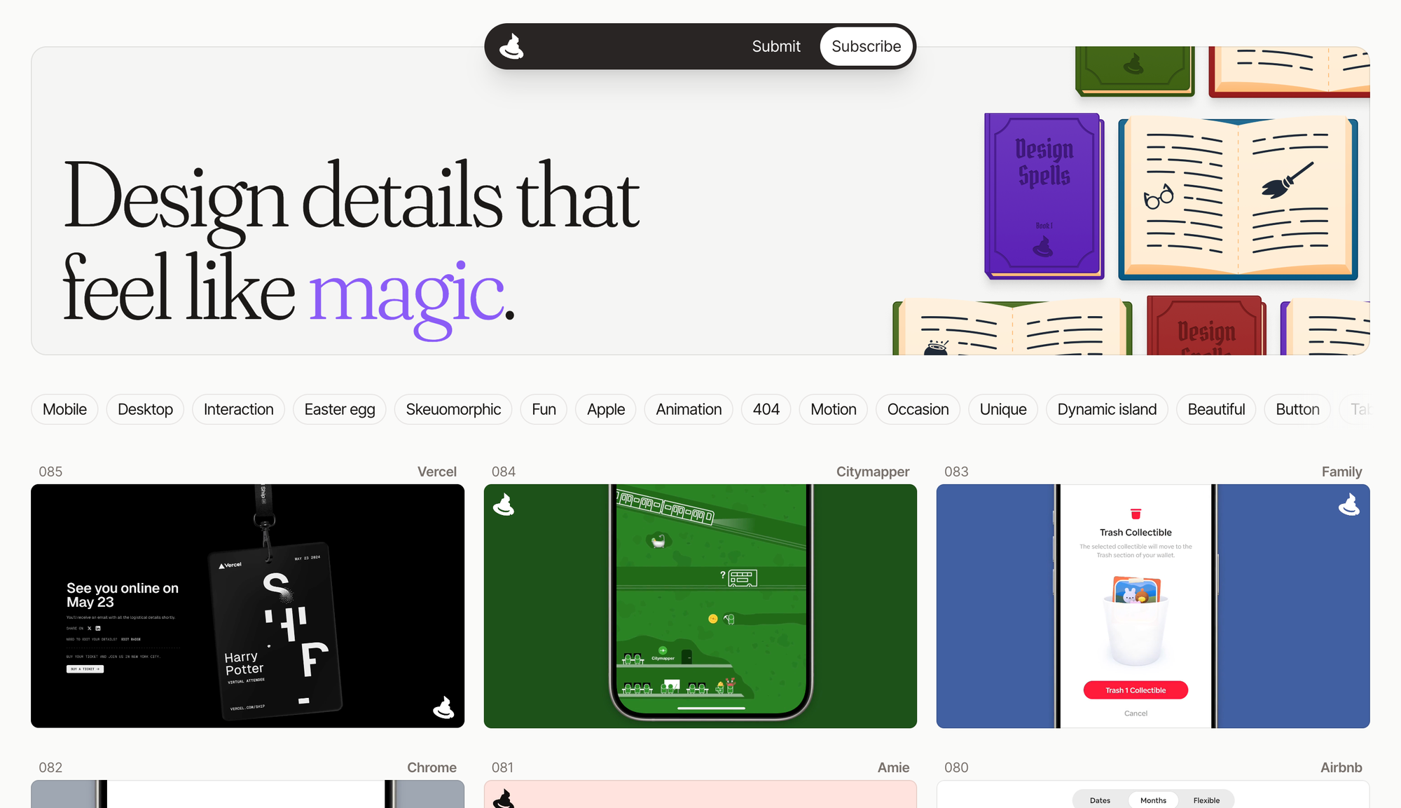 Design Spells зосереджений на мікровзаємодіях і дрібних дизайнерських деталях. Надихайтесь демонстраціями анімацій, "закладок" і елементів, які додають сайтам живості. Беріть за основу ці ідеї та інтегруйте у власні проєкти, створюючи інтерактивний та запам’ятовуваний досвід.