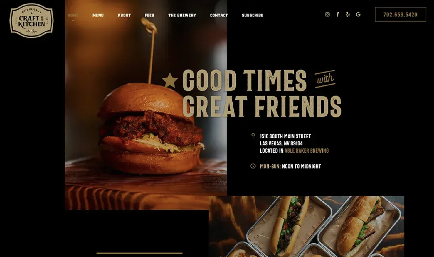 Відмінний приклад - сайт Arts District Kitchen. Основний заголовок набраний масивним брусковим шрифтом з цікавими лініями та формами. Літери мають сильний характер. Крім того, вони виглядають грубувато та пофарбовані в незвичайний колір – все це робить дизайн екстравагантним та оригінальним.