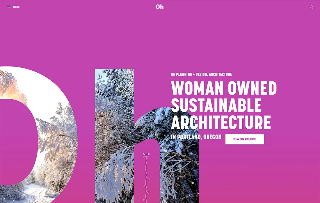 Хитрість у тому, щоб вибрати прості шрифти, зробити кількість великого тексту мінімальною та використовувати в інтерфейсі прості візуальні рішення. Дизайнер сайту вище відмінно впорався із завданням: яскраве тло, величезна назва (“Oh”) та простий текст, який інформує відвідувачів про призначення та цілі сайту, розміщений поверх великого напису.