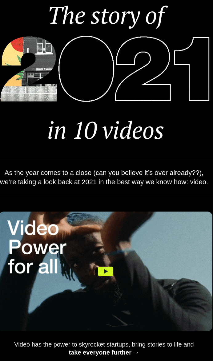 Vimeo надіслав цей електронний лист як підсумок 2021 року, і можна з упевненістю сказати, що вийшло в них це досить епічно й успішно. Бо для цієї розсилки бренд підготував відео.