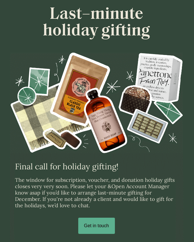 Конструкція заголовка точно створює фактор терміновості. Під заголовком і зображенням є текст із проханням до читачів: якщо вони спантеличені щодо покупок, вони завжди можуть проконсультуватися з брендом або обрати їх спеціальні новорічні пропозиції натиснувши кнопку заклику до дії (CTA) нижче.