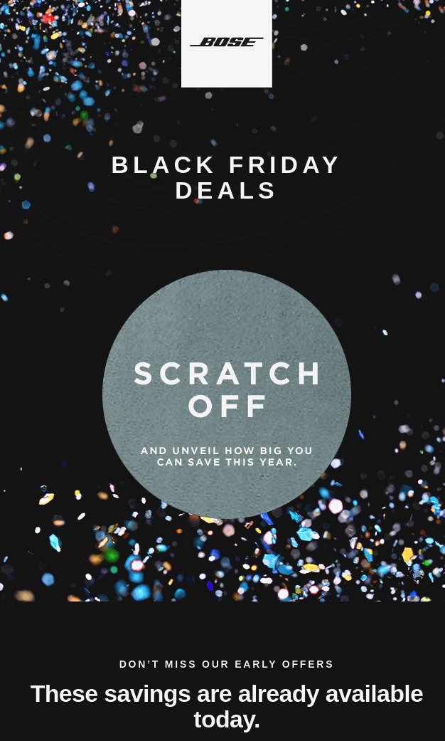 Лист дуже сподобався завдяки своїм інтерактивним елементам, які в будь-якому випадку привернуть увагу читача. Компанія Bose надіслала цей електронний лист, щоб розповісти про свій розпродаж у Чорну п’ятницю, водночас приєднати своїх читачів, попросивши їх подряпати та розкрити угоду. Такі конструкції ідеально підходять для того, щоб викликати цікавість за допомогою веселого елементу.
