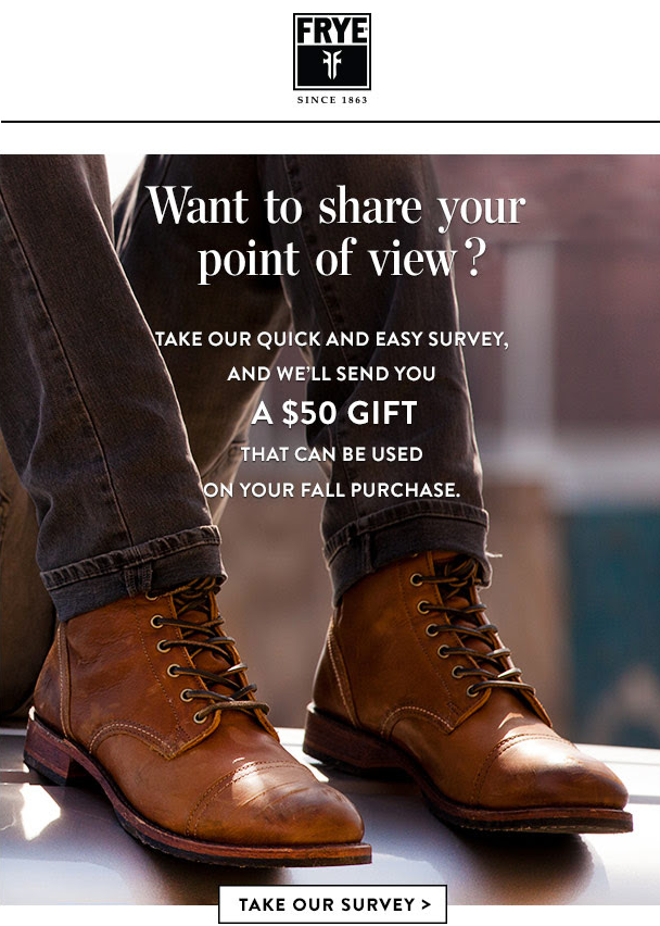 Це електронний лист із відгуками від бренду взуття, тому очевидно вони вибрали зображення свого продукту як фон електронного листа. Крім того, є того є точна копія, яка заохочує читачів заповнити форму відгуку та виграти знижку. Це повідомлення супроводжується великою та помітною кнопкою заклику до дії (CTA).