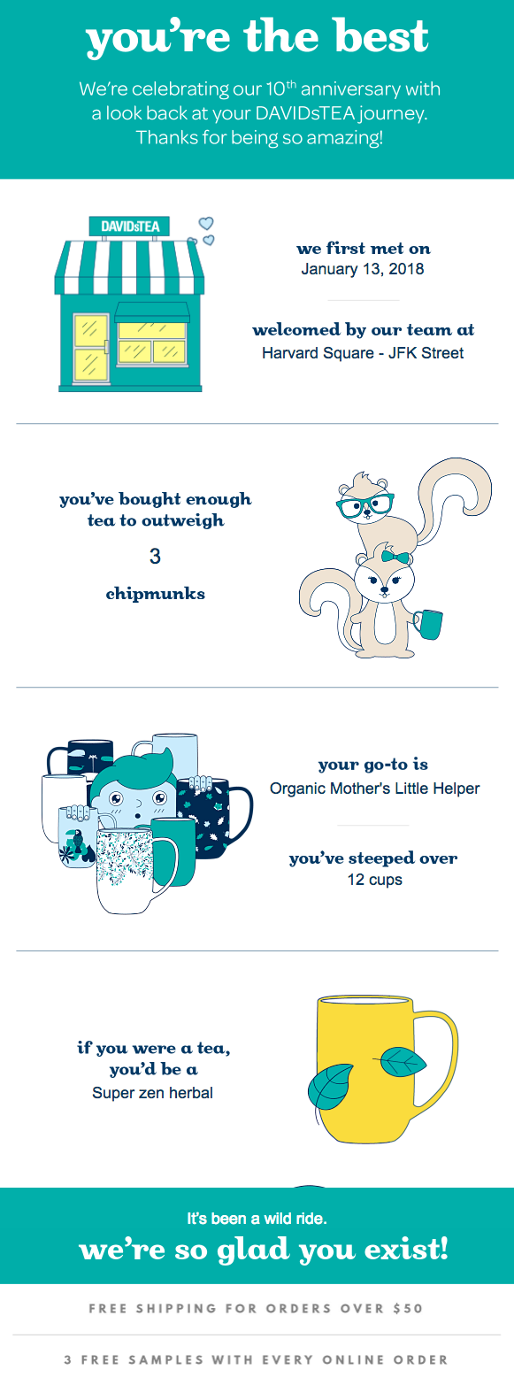 DAVIDsTEA надіслав цей електронний лист, щоб показати, наскільки бренд цінує своїх постійних клієнтів. Ідеально підібрані кольори та максимальна персоналізація. Крім того, сподобалась сегментація кожного повідомлення завдяки дизайнерському рішенню.