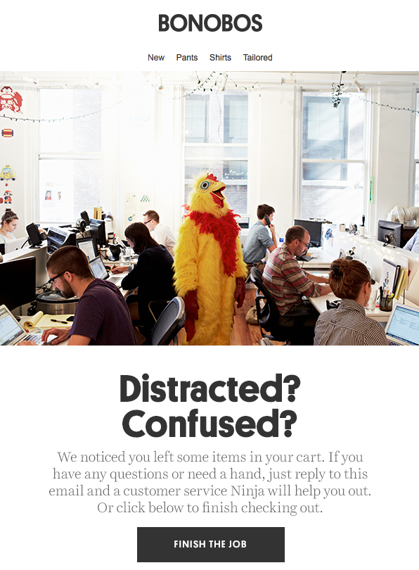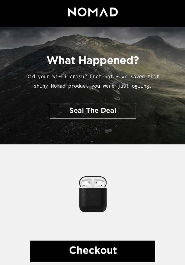 Цей електронний лист був розроблений, щоб скерувати читача до дії, тобто до завершення покупки. Фраза «Що трапилося?» моментально привертає увагу. Крім того, колірна гамма електронного листа ідеально поєднується з продуктом, про який йде мова.