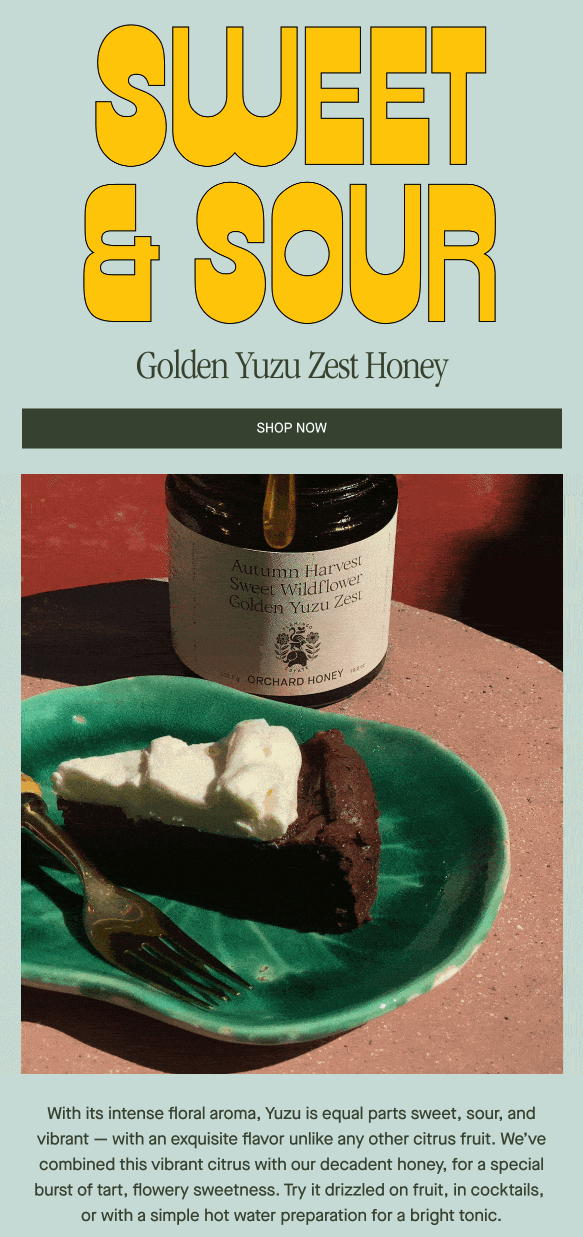 Flamingo Estate надіслав цей електронний лист для того, щоб представити свій новий смак меду – Golden Yuzu Zest Honey.