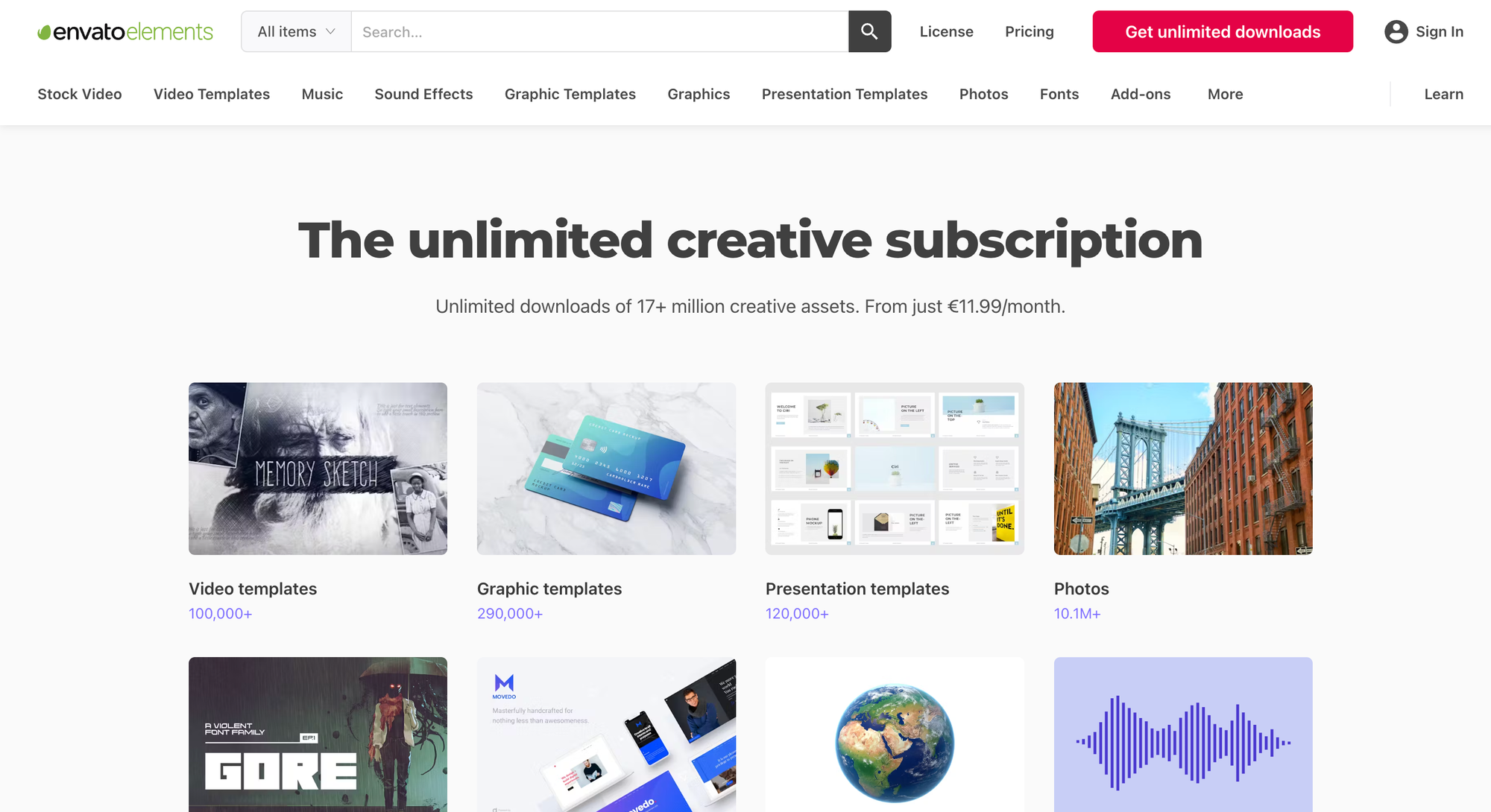 Колекція Envato Elements пропонує кілька мільйонів цифрових ресурсів. Там ви знайдете: векторні ілюстрації, відео, фотографії, шрифти, шаблони графіки, аудіо, вебшаблони та багато іншого.