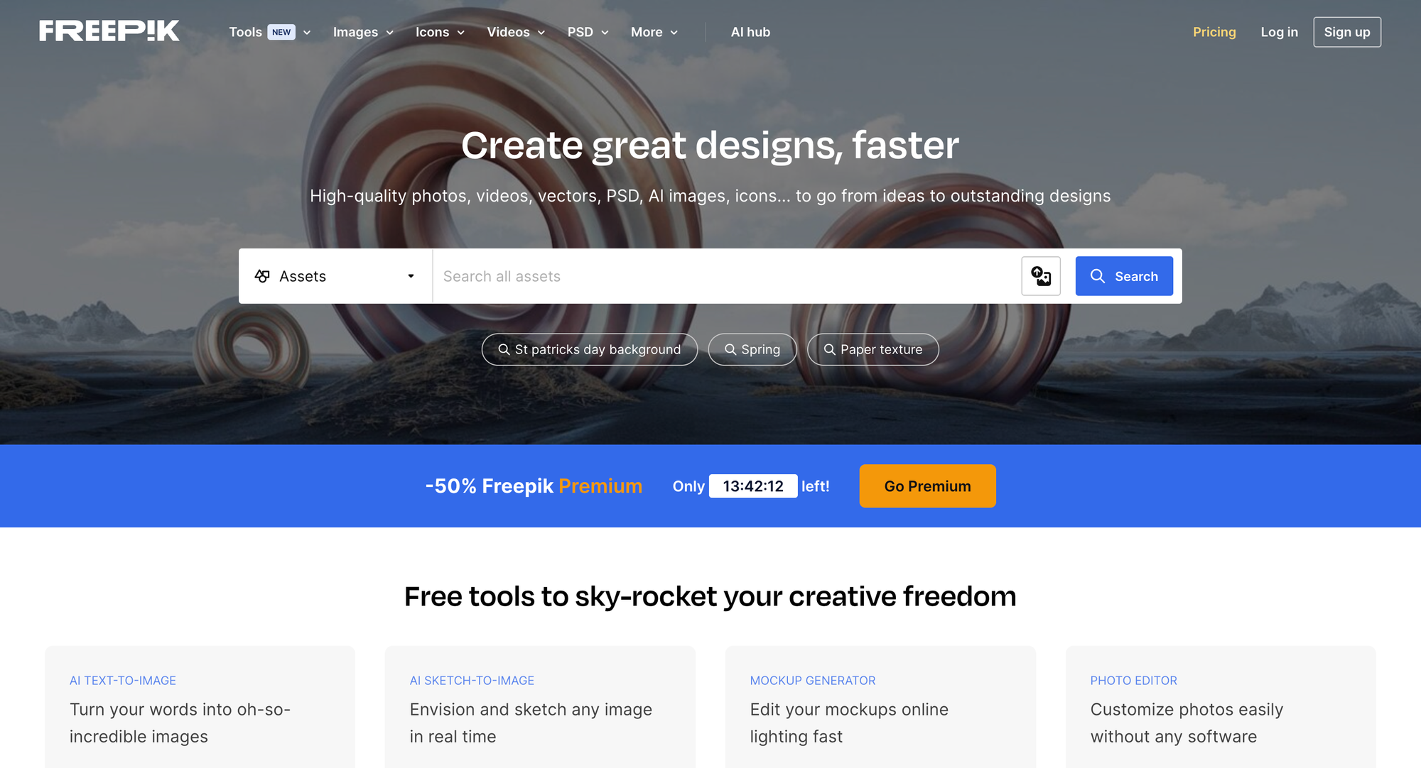 Freepik пропонує широкий вибір безкоштовних і платних цифрових ресурсів. Крім векторних зображень, ви знайдете фотографії та PSD файли, які можна використовувати у власних дизайнерських проєктах. Тисячі учасників регулярно додають новий контент на сайт Freepik, тому колекція постійно поповнюється, а вибір стає ширшим. Ціна за 100 завантажень на день стартує від $9,99 на місяць.