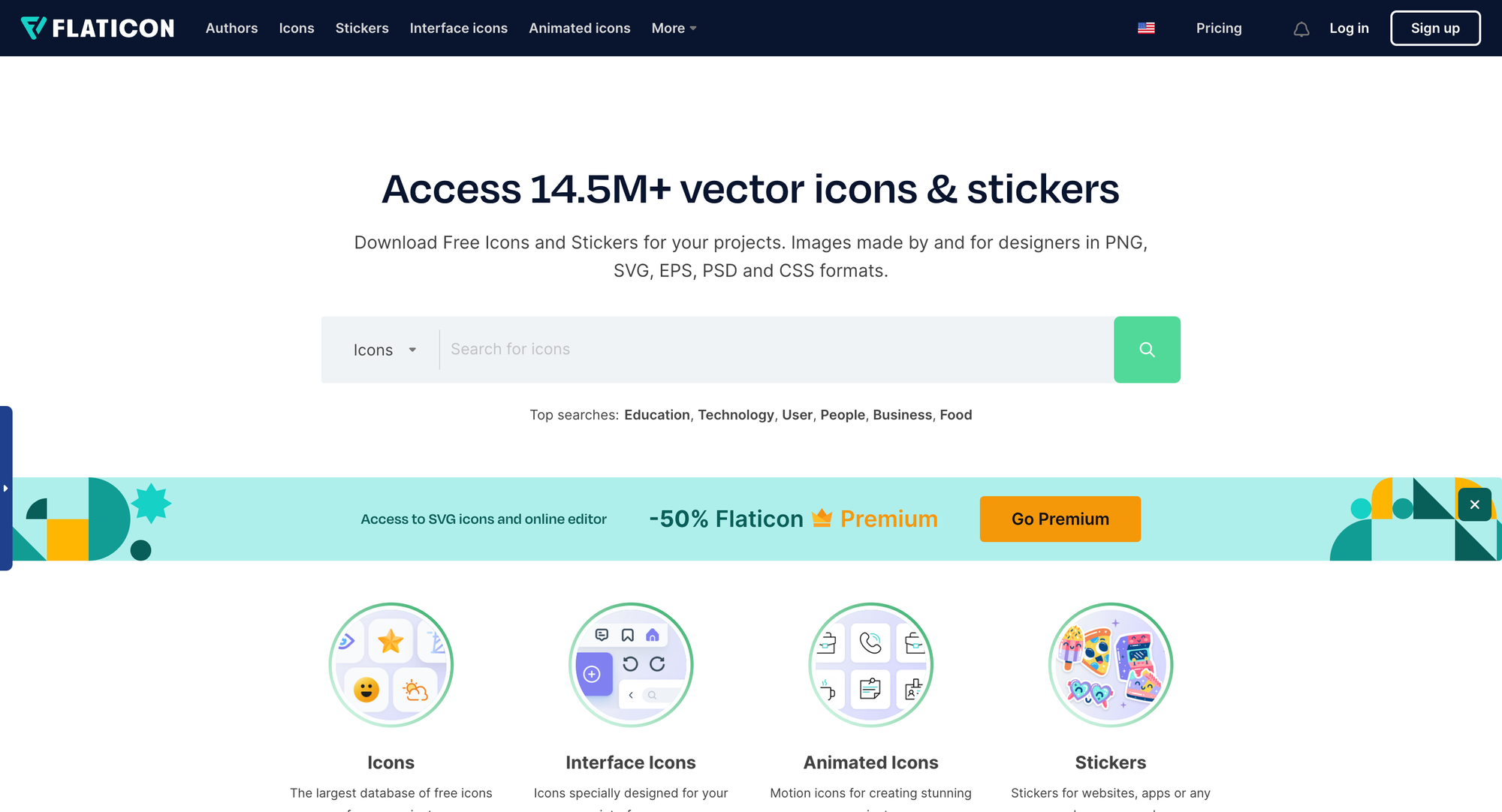 Flaticon — сервіс, що належить Freepik, і, як видно з назви, сайт орієнтований переважно на іконки. Там можна знайти мільйони іконок у векторному (SVG та EPS) та в інших форматах (PNG, PSD). На сайті також представлена колекція наліпок. Вартість передплати починається від $8,25 на місяць, що дає можливість звантажувати до 2000 іконок на день.