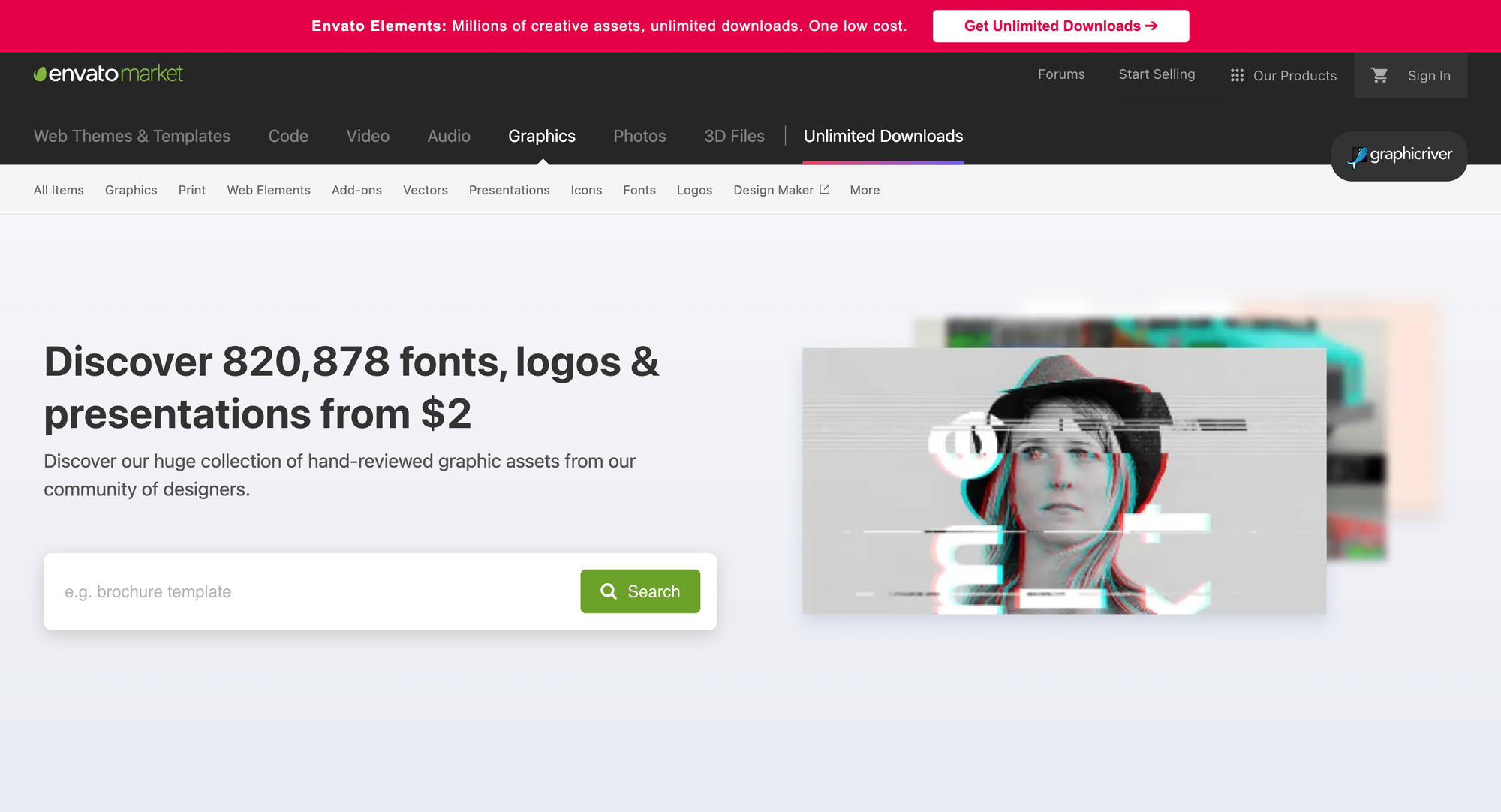 GraphicRiver — це частина сімейства вебсайтів Envato. Кілька років тому це був самостійний ресурс, а тепер він входить до складу групи Envato Market разом з ThemeForest. На сайті GraphicRiver ви знайдете мільйони цифрових ресурсів, включаючи широкий вибір векторних зображень.