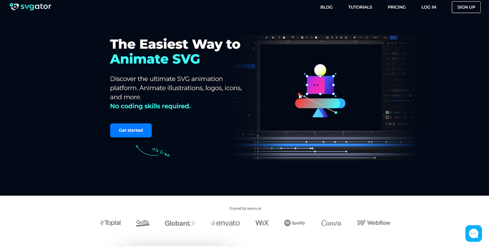 SVGator спеціалізується на SVG-анімаціях, які використовують векторну математику для створення легких 2D-ефектів. Функція запуску анімацій за кліком чи прокруткою робить його ідеальним для вебелементів. Безкоштовна версія дозволяє створювати до трьох анімацій на місяць, а платна — знімає обмеження та інтегрується з Webflow.