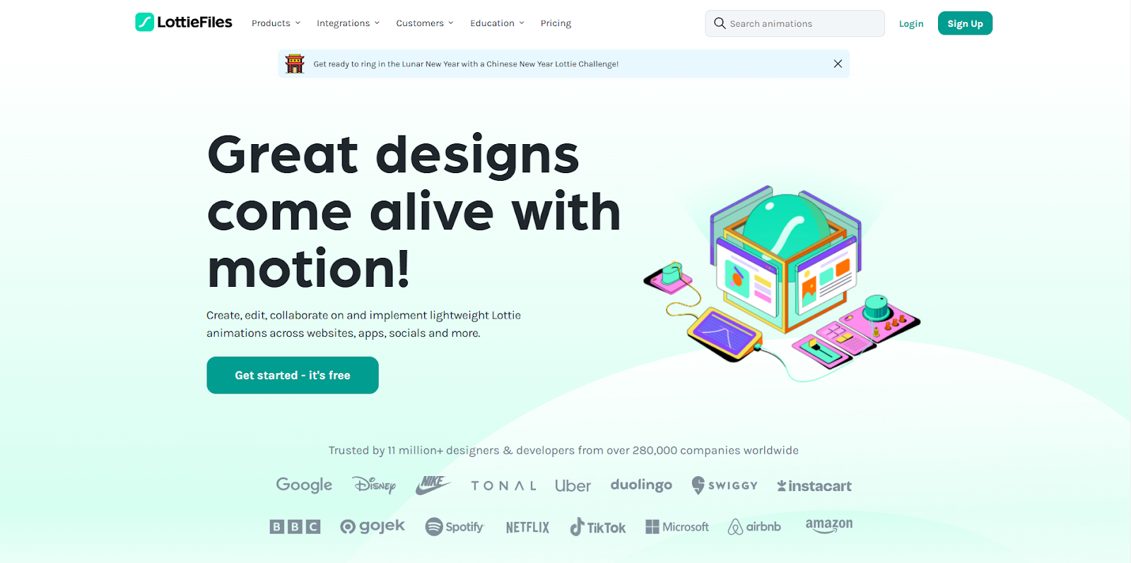 LottieFiles запровадив використання JSON-файлів для легких і швидких анімацій. Він інтегрується з Webflow, After Effects і Figma, надаючи широку сумісність і функції для створення анімацій із мінімальним навантаженням на сайт.