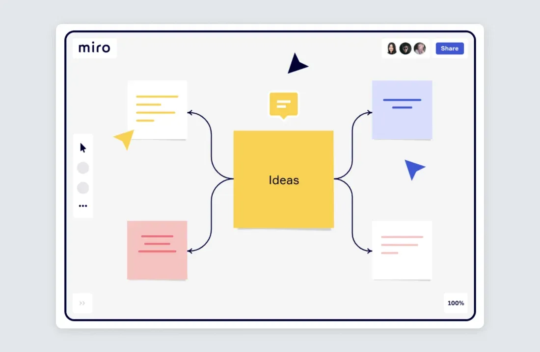 У 2023 році, коли багато команд працюватимуть віддалено, проведення мозкових штурмів в режимі онлайн стане новим стандартом. Такі інструменти як Miro або Microsoft Whiteboard допомагають членам команди практикувати спільне дизайн-мислення. Використовуйте ці інструменти, щоб зробити ваші мозкові штурми ефективнішими: