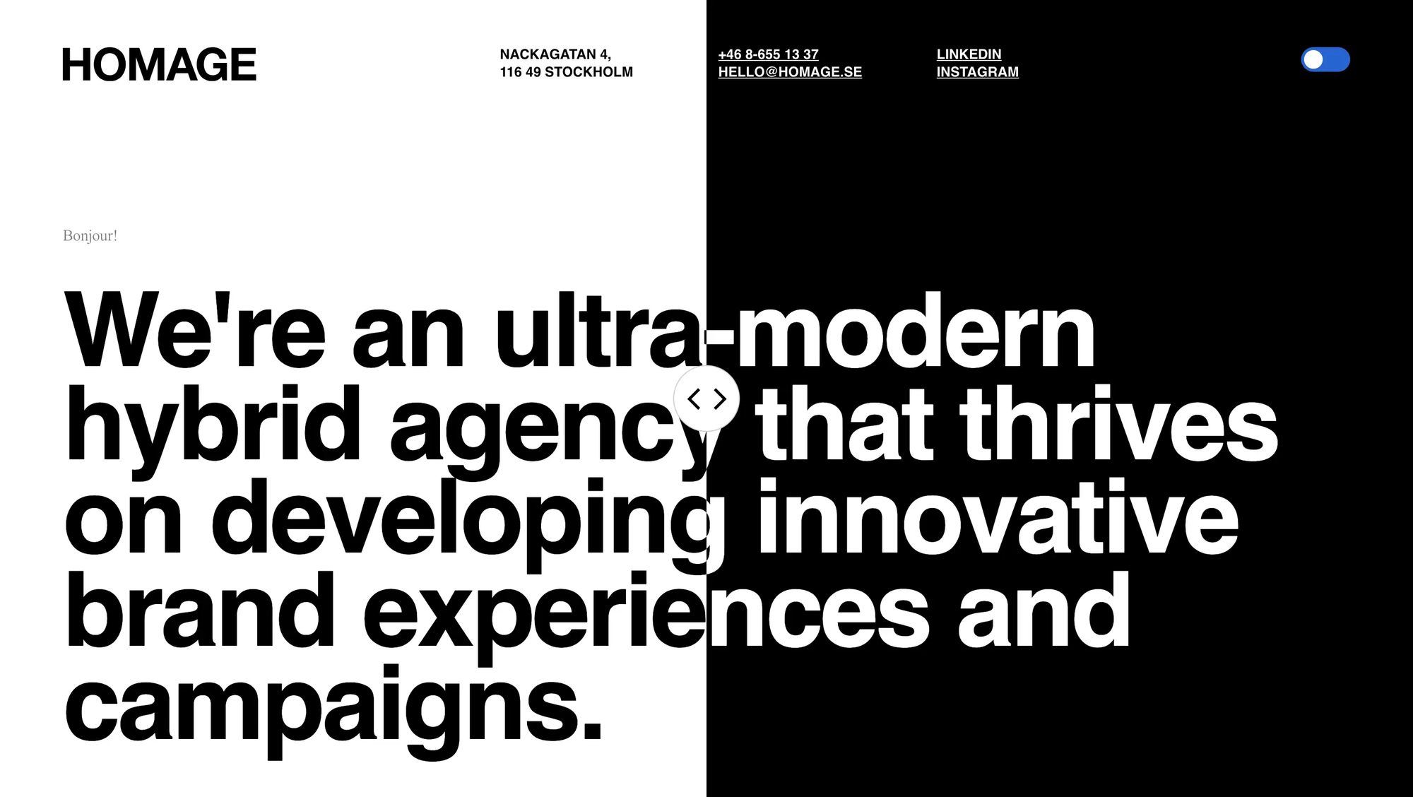 Цей підхід дає простір для експериментів. Наприклад, креативна агенція Homage (перший приклад) розділила екран за допомогою інтерактивного слайдера, де користувач може змінювати співвідношення колонок, пересуваючи повзунок. Це оригінальне рішення, яке підвищує рівень залученості!