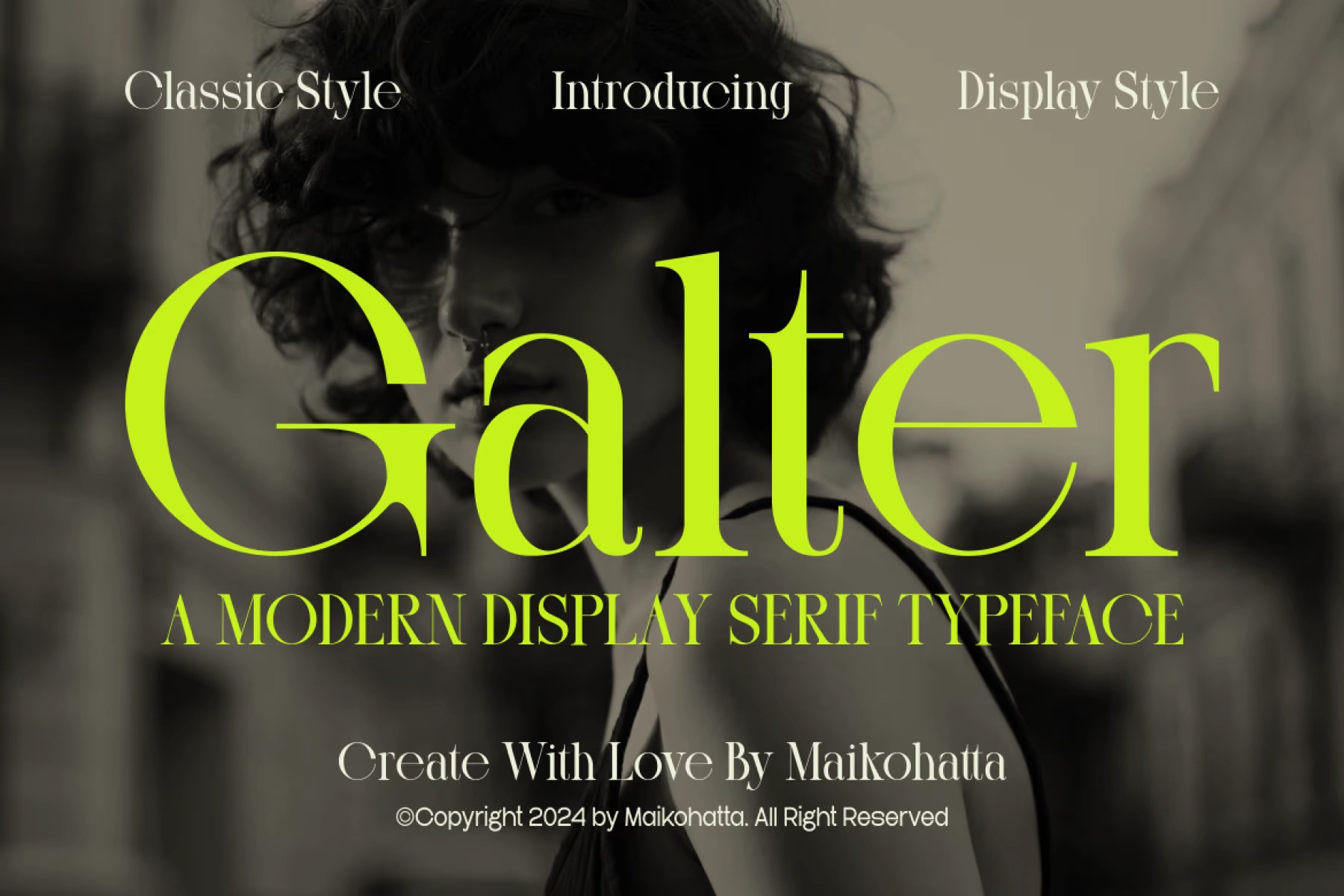 Galter вирізняється сміливими контрастними штрихами, які формують естетичні, але читабельні форми. Цей сучасний шрифт із засічками має стриманий вигляд, проте завжди привертає увагу.