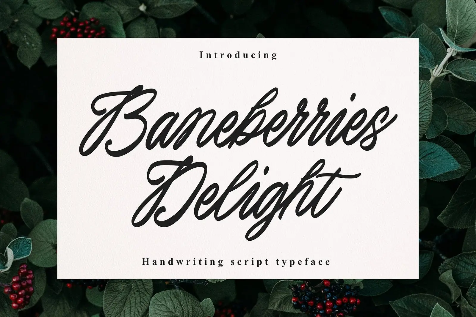 Baneberries Delight — химерний, елегантний рукописний шрифт. Плавні штрихи та витончені вигини передають природну витонченість і чарівність каліграфії, додаючи теплоту та особисту участь у будь-який дизайн.