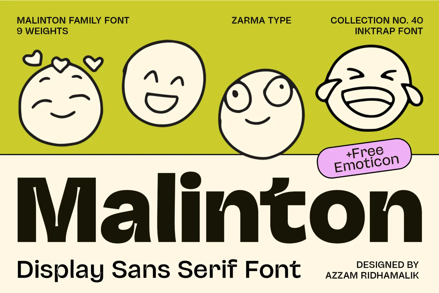Malinton — грайливий декоративний гротеск, який додає індивідуальності вашим проєктам. Він включає 9 накреслень, понад 360 гліфів, підтримку 85+ мов, набір смайликів і чудово підходить для логотипів, оформлення соцмереж, заголовків та інших задач. Це відмінний варіативний шрифт із трендовими чорнильними пастками, що поєднує креативність і професіоналізм.