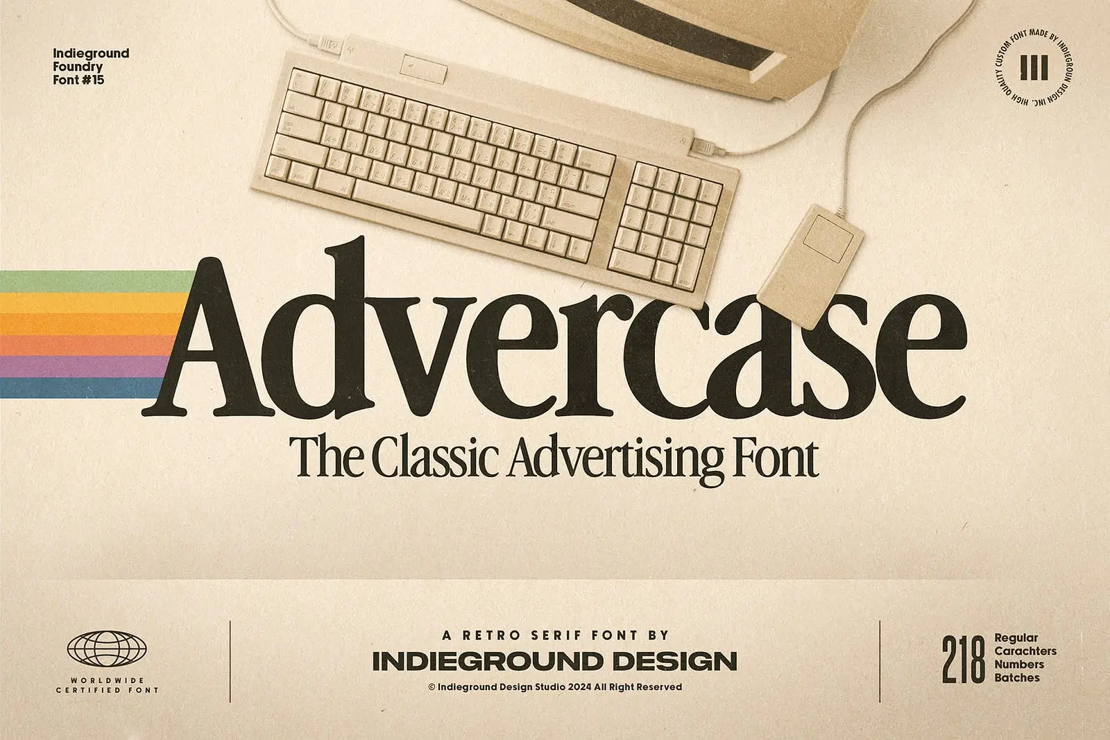 Advercase — шрифт із засічками, що поєднує ретро-стиль з нотками сучасності. Він ідеально підходить для ностальгічних, але водночас елегантних проєктів — від реклами до креативних інтерфейсів, надаючи характеру будь-якому дизайну.