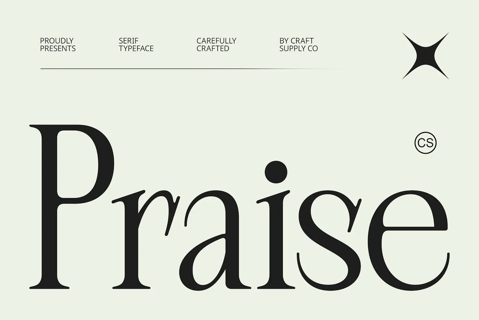 CS Praise — сучасна антиква з гострими засічками та висококонтрастними штрихами, що передає елегантність, розкіш та ексклюзивність. Вишукана та естетична, вона ідеально підходить для оформлення люксових модних брендів та витонченої поліграфії.