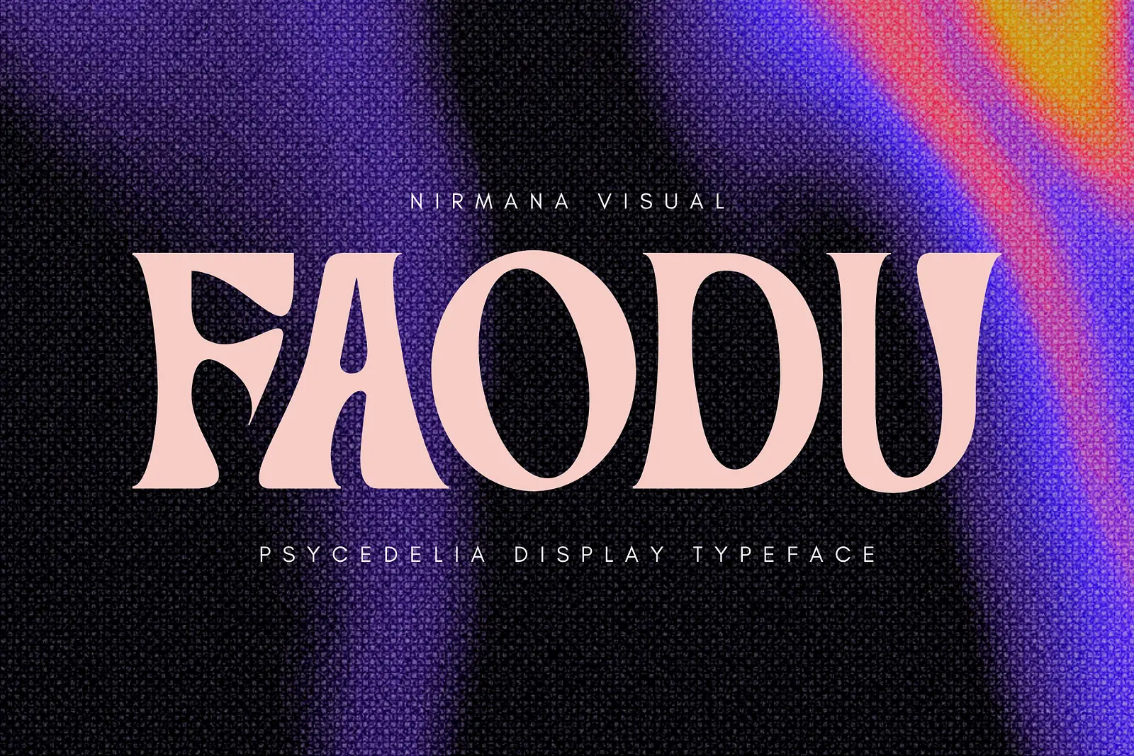 Faodu — сміливий шрифт, що запам'ятовується, натхнений психоделічним мистецтвом 60-х і 70-х років. Хвилясті форми та органічні вигини випромінюють чарівність ретро та волелюбну енергію, що робить його чудовим вибором для постерів, обкладинок альбомів, брендингу та творчих проєктів з ностальгічним ухилом.