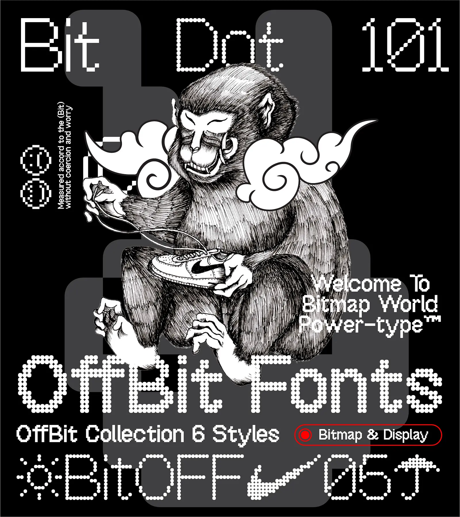 OffBit — декоративний шрифт у стилі Bitmap. Гліфи складаються з видимих пікселів різної форми (квадратів, точок і прямокутників із округленими кутами), що викликає асоціації з програмуванням і технологіями. Така типографіка виглядає стильно та ефектно в будь-яких проєктах.