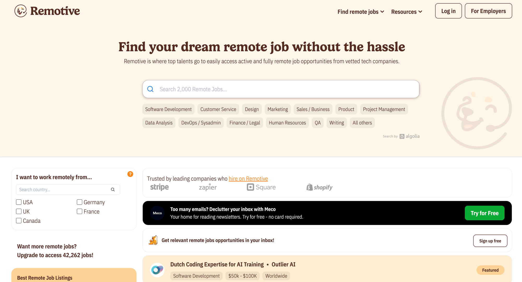Remotive – це платформа для тих, хто шукає віддалену роботу в технологічних компаніях. Окрім вакансій, сайт пропонує спільноту та корисні поради щодо дистанційної роботи.