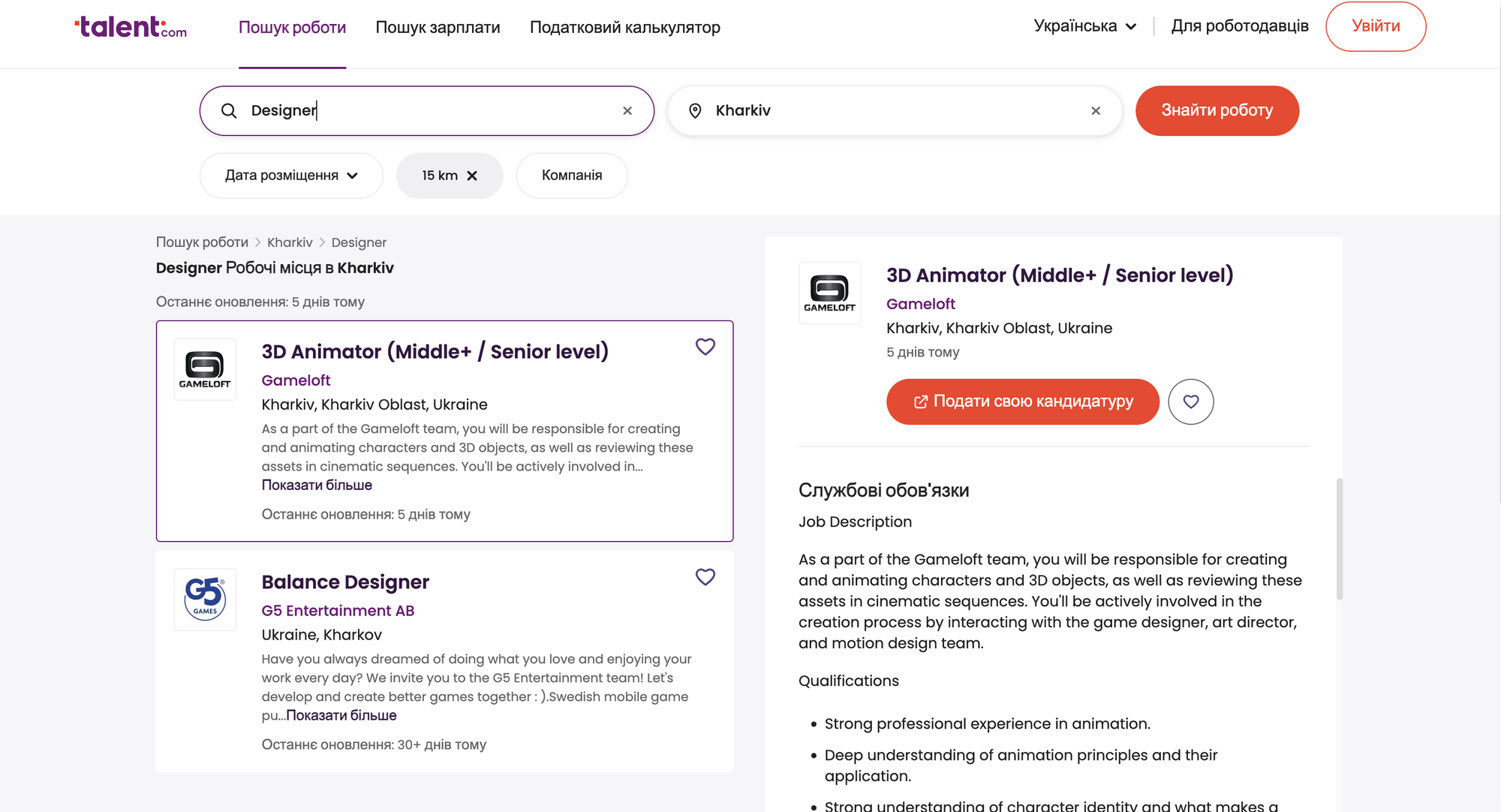 Talent.com агрегує вакансії з тисяч різних ресурсів. Пошук можна фільтрувати за категоріями, рівнем досвіду та локацією. Є функції сповіщення про нові вакансії та створення резюме.