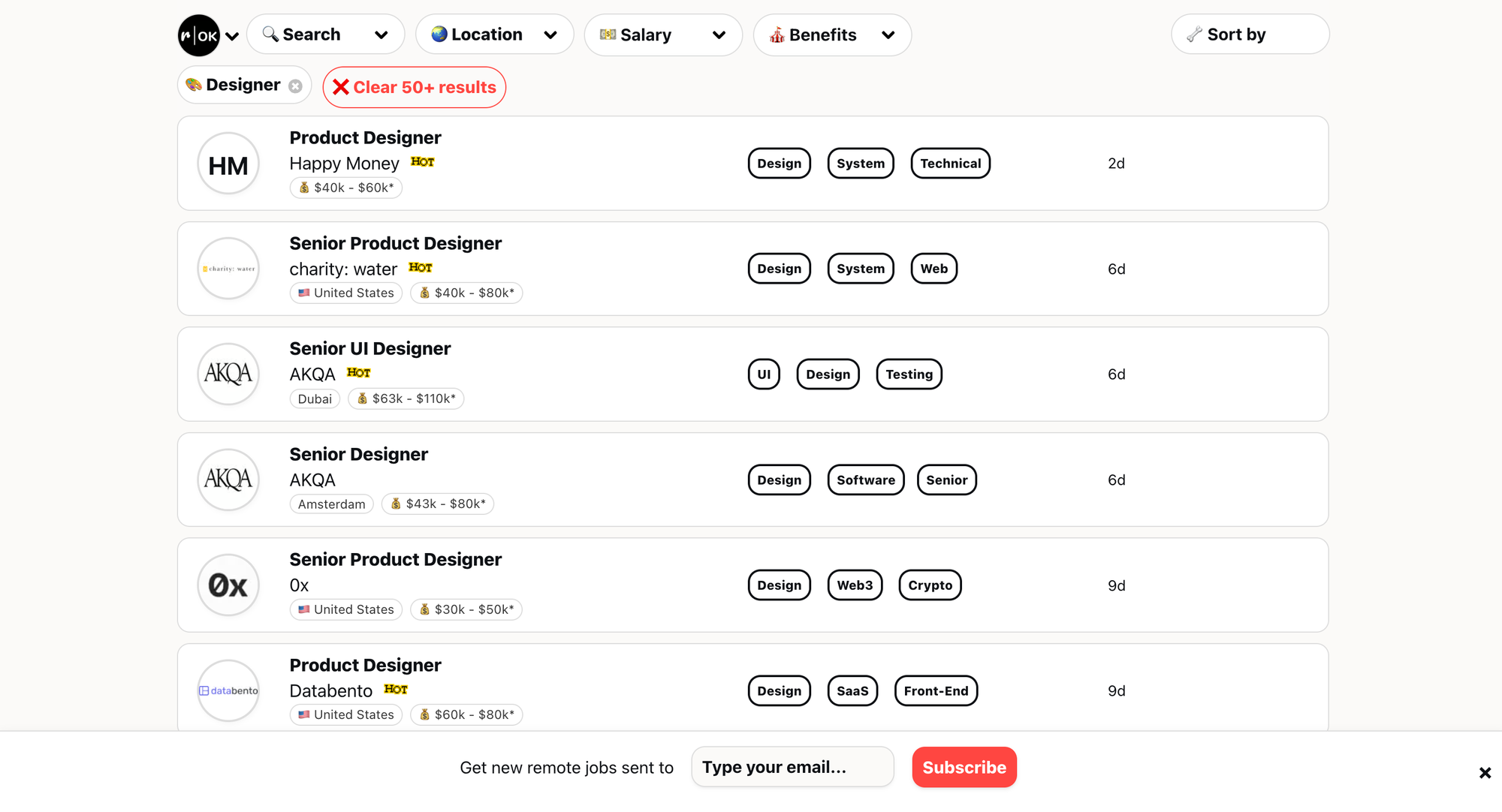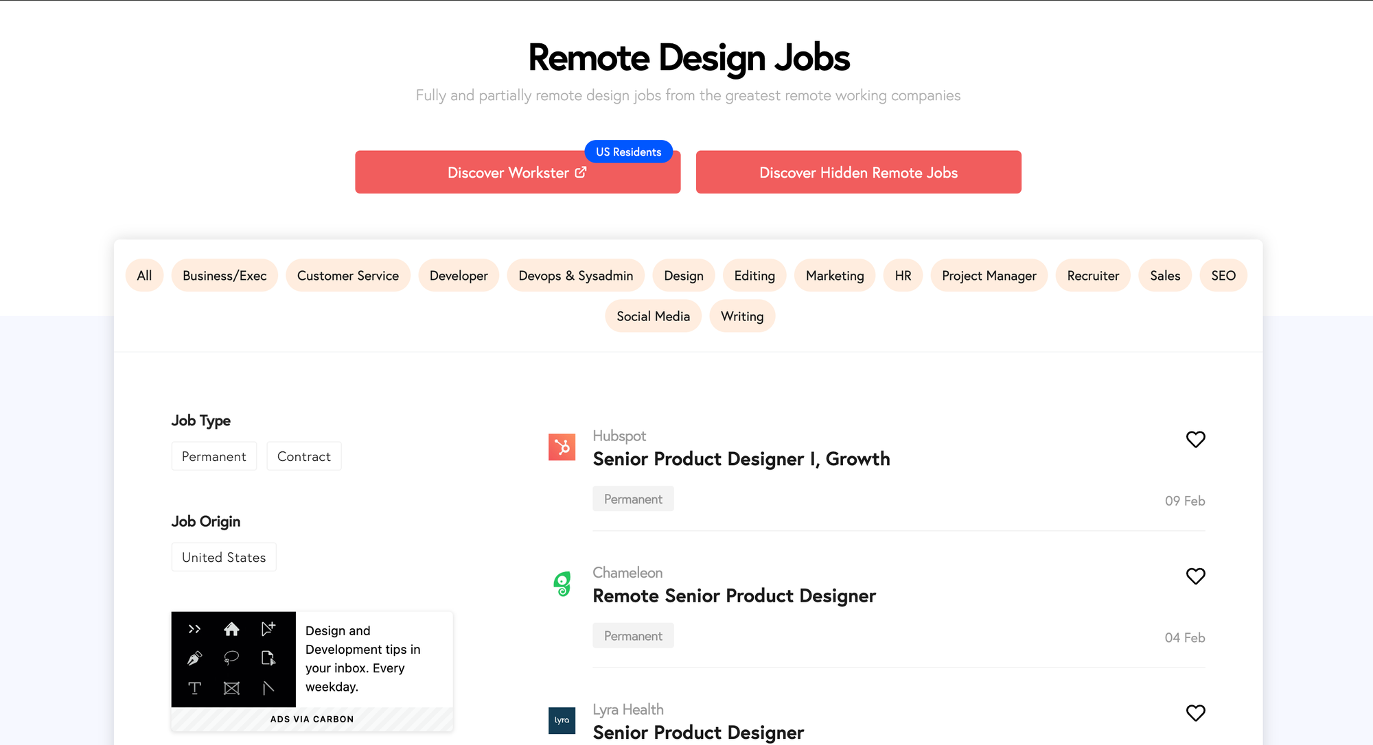 Remote.co - платформа з ремоут вакансіями в різних сферах, зокрема в дизайні та маркетингу. Окрім вакансій, сайт пропонує інтерв’ю з компаніями, які активно шукають віддалених співробітників.