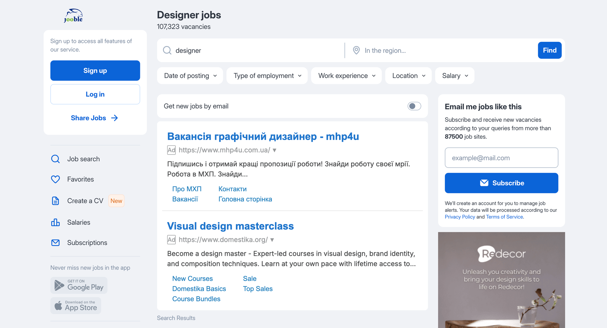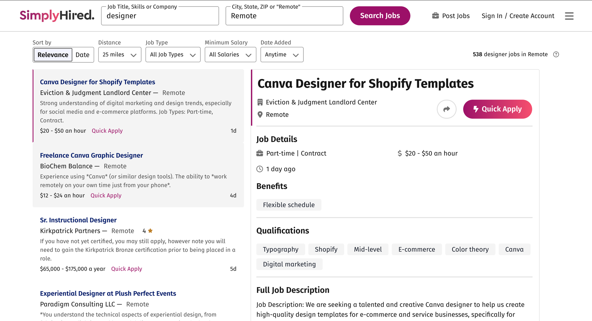 SimplyHired агрегує вакансії з різних джерел і надає корисні інструменти для створення резюме та підготовки до співбесід. Сайт підходить для дизайнерів, маркетологів і IT-спеціалістів, які шукають як фриланс, так і фул тайм роботу.