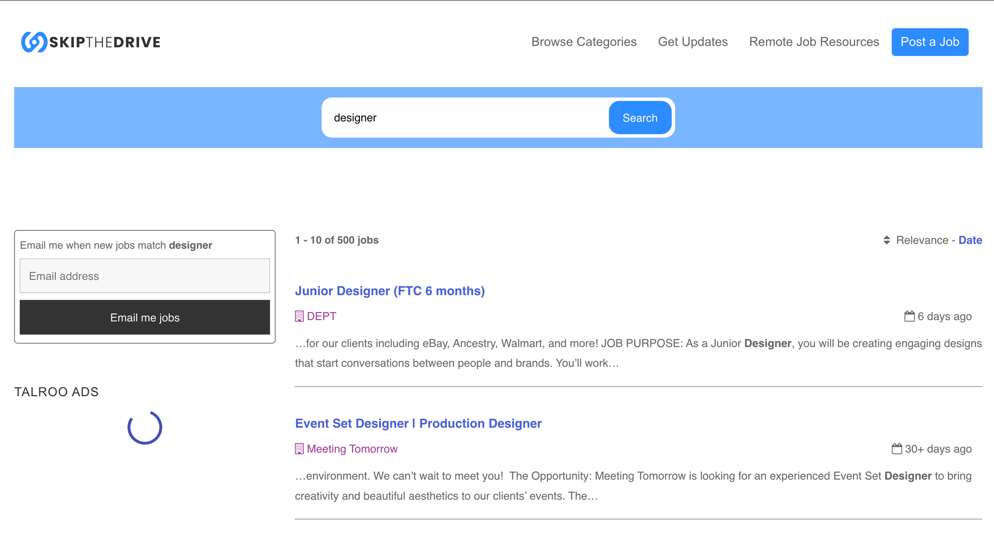 Skipthedrive ще один ресурс для пошуку віддаленої роботи. Платформа дозволяє створити профіль, додати резюме та отримувати сповіщення про нові вакансії.