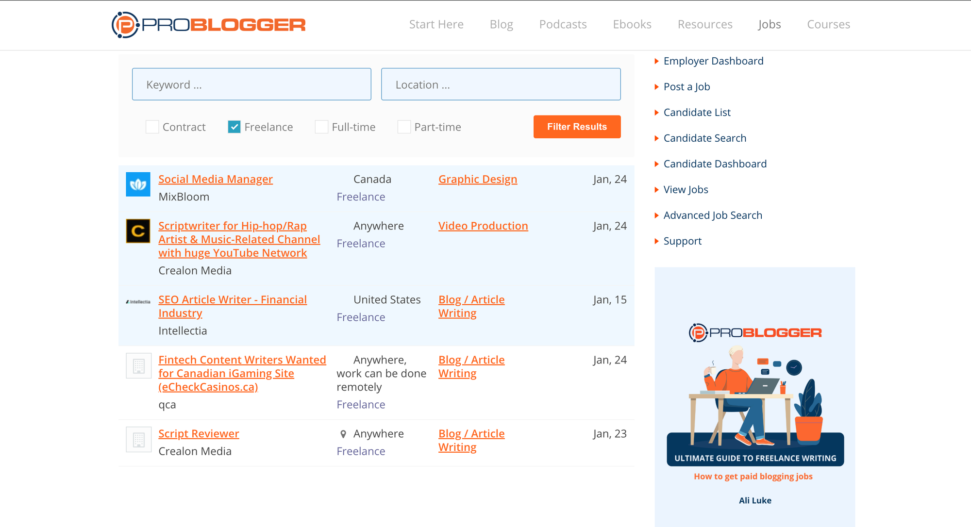 ProBlogger Jobs підходить для блогерів та авторів, які шукають роботу у сфері контент-маркетингу та створення текстів для бізнесу.