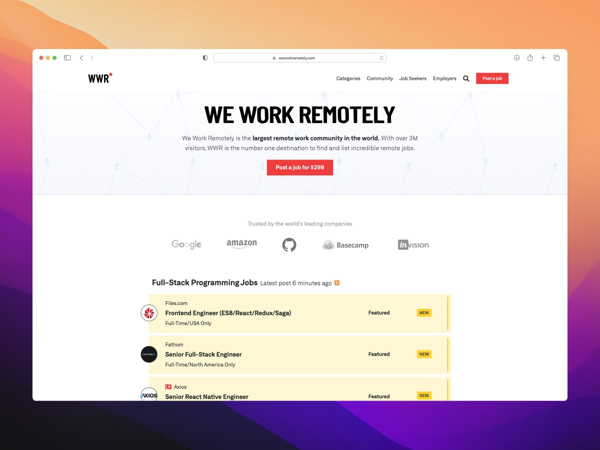 WeWorkRemotely – ресурс з віддаленими вакансіями у сфері дизайну, маркетингу, ІТ та інших напрямках. Платформа має простий інтерфейс, де можна швидко знаходити пропозиції без потреби створювати профіль.