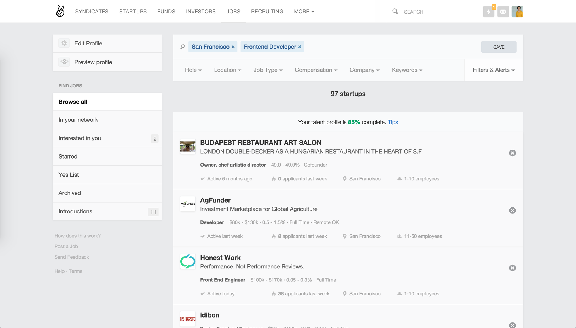 AngelList – платформа для пошуку роботи в стартапах, яка дозволяє спілкуватися із засновниками компаній та отримувати пропозиції без посередників. Багато вакансій передбачають можливість отримання частки в бізнесі замість або на додаток до зарплати.