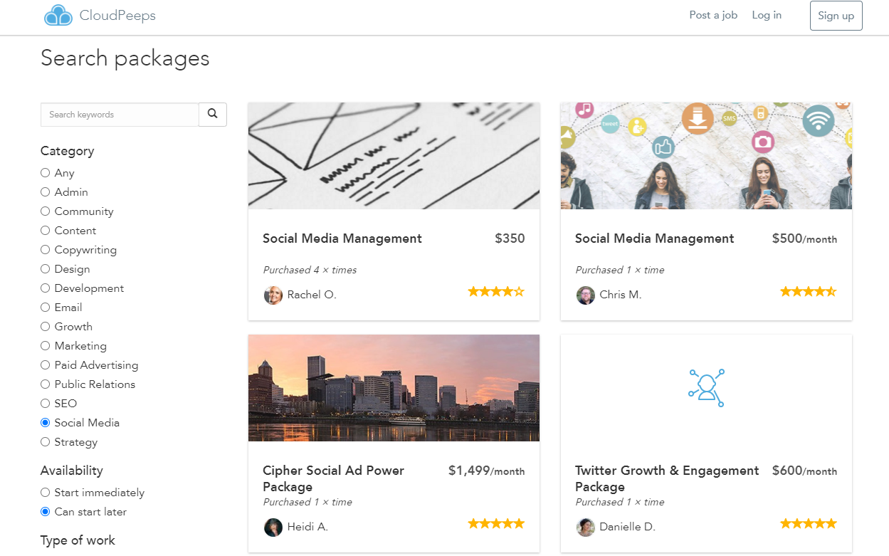 CloudPeeps орієнтується на фрилансерів у сферах маркетингу, контенту, PR та дизайну. Платформа дозволяє спеціалістам створювати профілі, демонструвати свої навички та отримувати замовлення від компаній. Робота здійснюється за моделлю закритої спільноти, що дозволяє ефективніше та швидше відбирати спеціалістів.