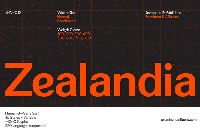 Zealandia - гуманістичний гротеск, який відрізняється універсальністю та адаптивністю. Спочатку він був створений на прохання дружини дизайнера, яка шукала шрифт для складання карток. Виклик був прийнятий - в результаті з'явився шрифт Zealandia, який не тільки підходить для картографії, але й чудово виглядає в інших контекстах.