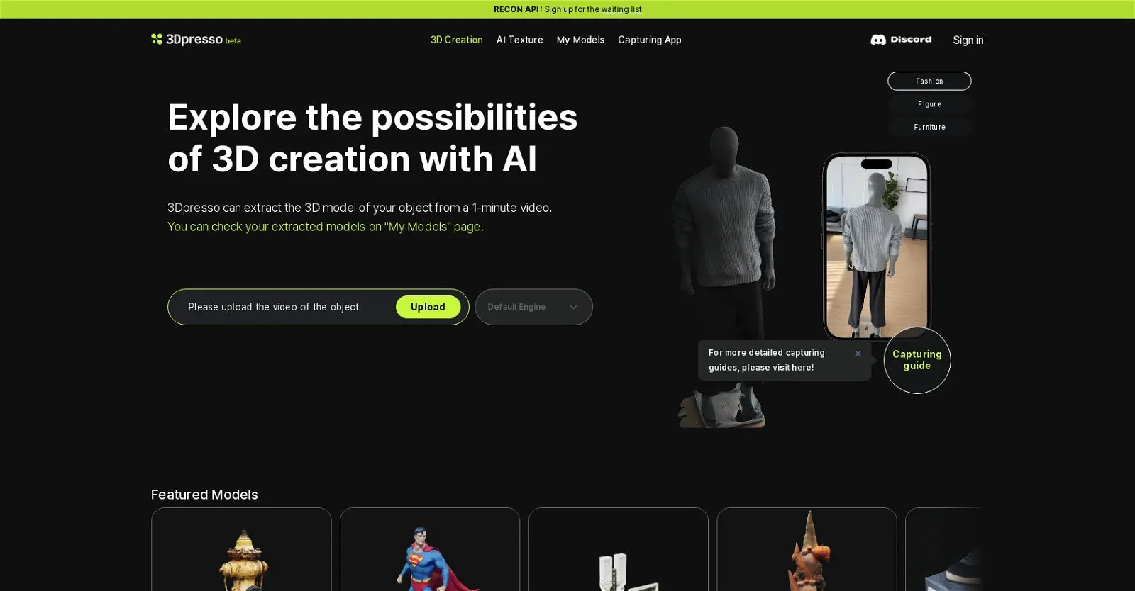 3Dpresso — це вебплатформа, яка дозволяє створювати 3D-моделі та текстури на основі 1-2-хвилинних відео об’єктів. ШІ технологія витягує 3D-модель з об’єкта на відео, після чого, новостворені моделі можна переглянути на сторінці «Мої моделі» та завантажити у форматі *.glb. Розробка моделі займає приблизно 30 хвилин (час варіюється в залежності від якості моделі), а платформа надсилає сповіщення, коли модель стає доступною для завантаження. Додатково платформа має функцію AI Texture. Вона допомагає генерувати різні варіації текстур 3D-моделей. Самі текстури можна видозмінювати за допомогою генеративних AI підказок.
