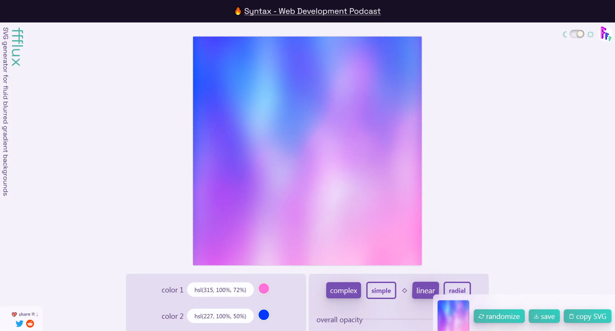 Цей генератор градієнтів допоможе вам створювати плавні та органічні переходи кольорів для фонових зображень або окремих елементів. Сервіс простий у використанні: спершу виберіть два кольори, а потім експериментуйте з режимами накладання та розмиття. Ви зможете створювати як прості, так і складні градієнти, щоб додати вашому дизайну відчуття руху.