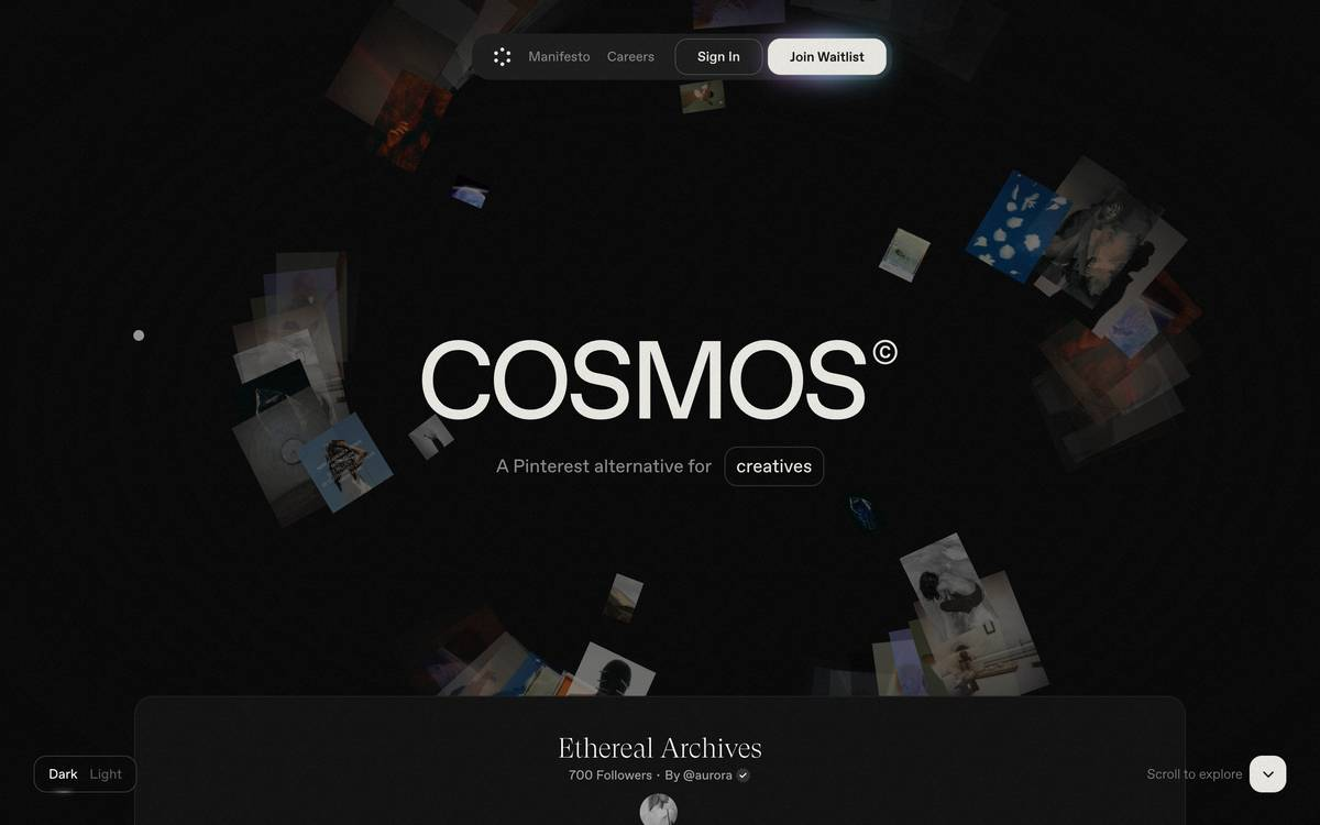 Cosmos — це абсолютно нова, чудово реалізована альтернатива Pinterest для дизайнерів. Використовуйте Cosmos для створення візуальних нотаток, збереження натхнення, пошуку референсів для дизайну. Тут відсутні лайки. коментарі, сповіщення. Керувати візуальним світом Cosmos можна за допомогою спеціального плагіну у браузері чи в iOS додатку.